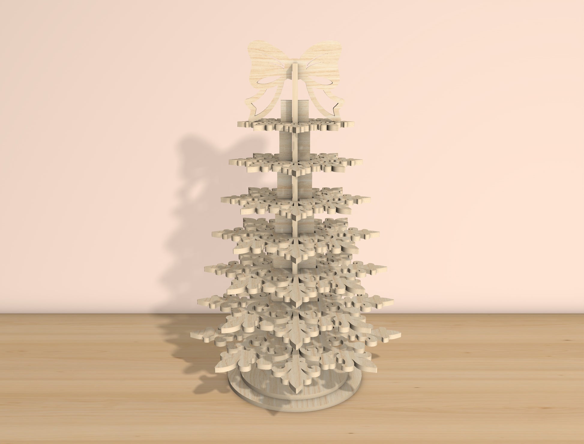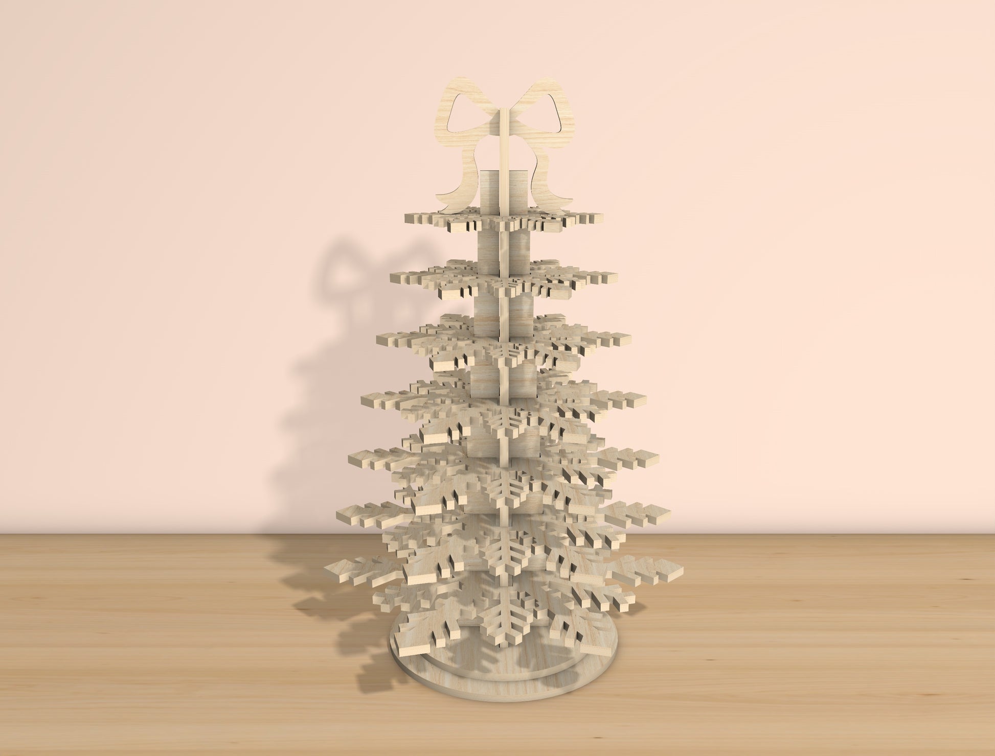 Create stunning 3D tabletop Christmas trees featuring intricate snowflake tiers and interchangeable star or bow toppers. Perfect for festive home decor and seasonal centerpieces.