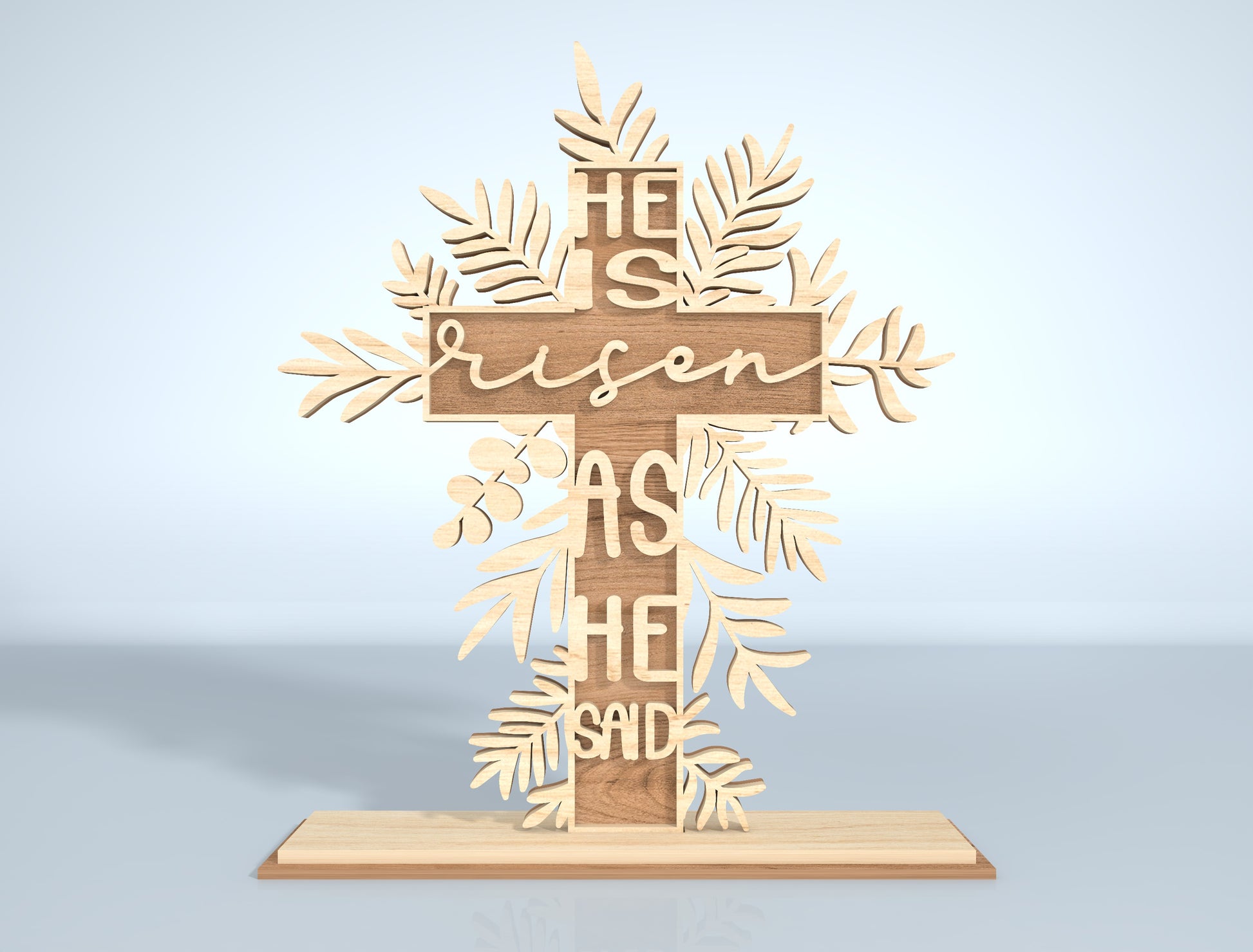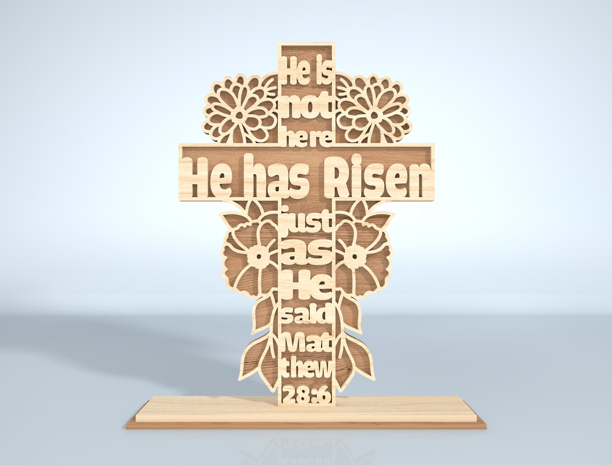This premium collection features six artistic cross designs blending intricate floral patterns with sacred scripture from Matthew 28:6. The multi-layered construction provides a beautiful 3D effect, ideal for religious gifts and home sanctuary decor.