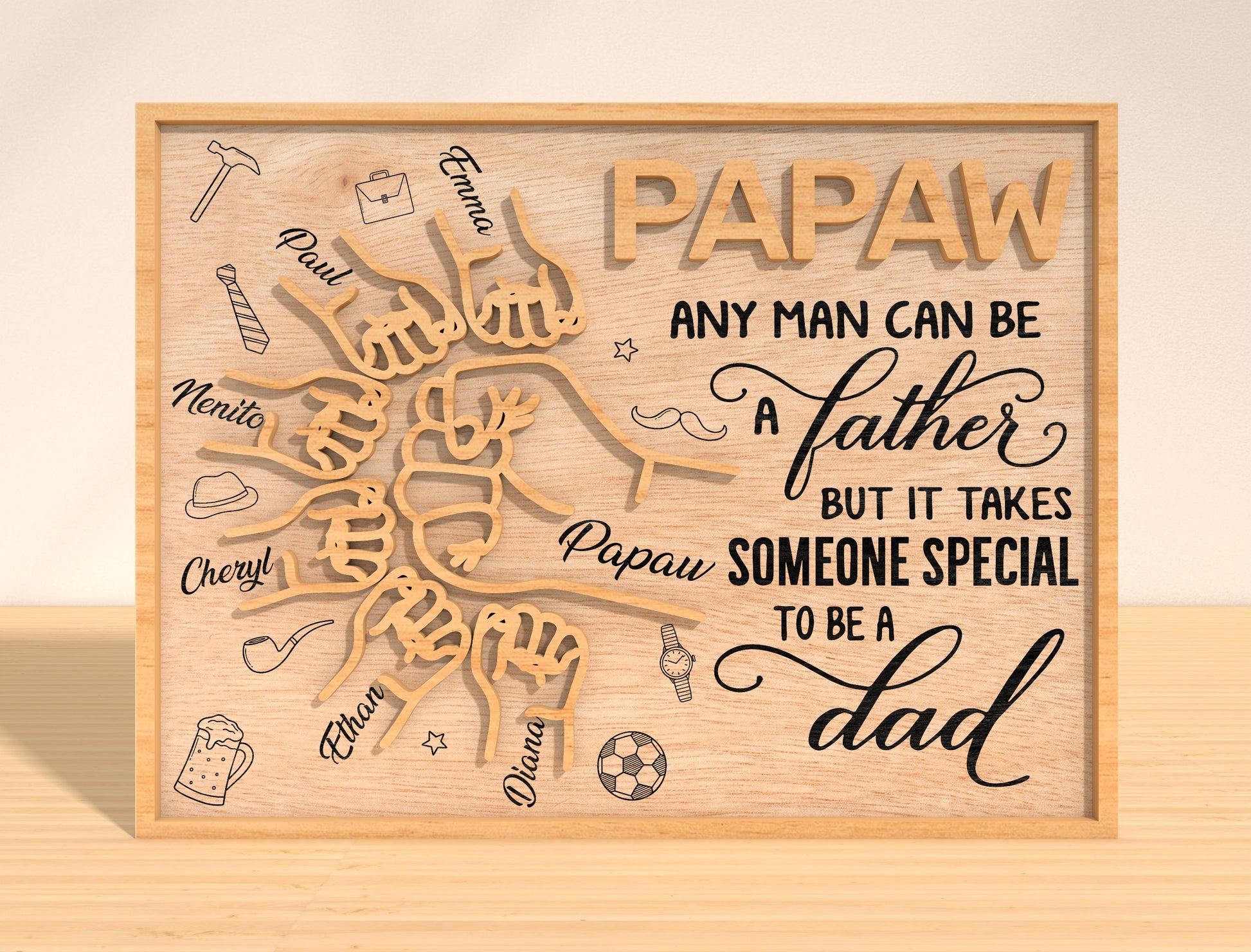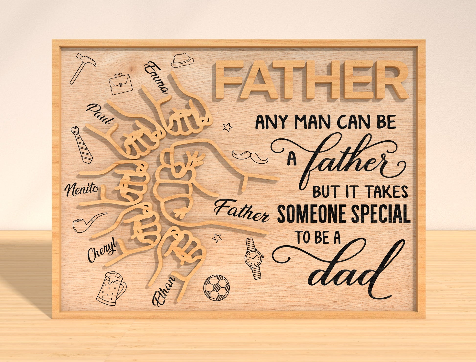 This laser cut design features a bold Best Dad teamāstyle tabletop sign with a strong father fist in the center and a smaller childās fist below, symbolizing family bond and strength. The design includes the visible text āBest Dadā at the top and a vertical name engraved on the lower fist, as shown in the design. Surrounding icons such as a fishing rod, hammer, tie, beer mug, and soccer ball add a playful mix of dad hobbies and interests, making this piece both personal and fun.