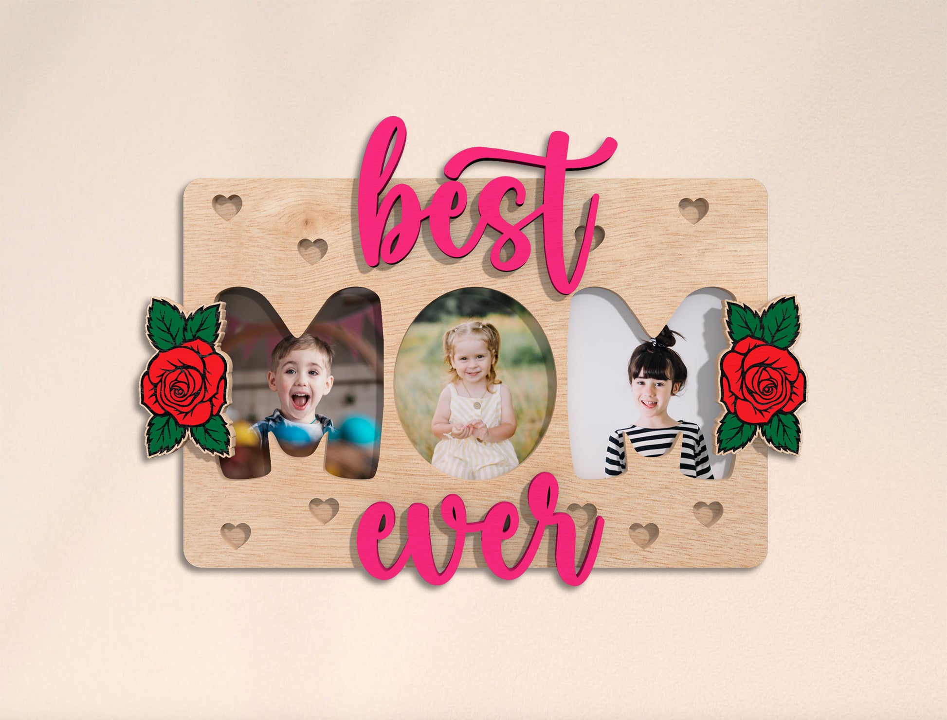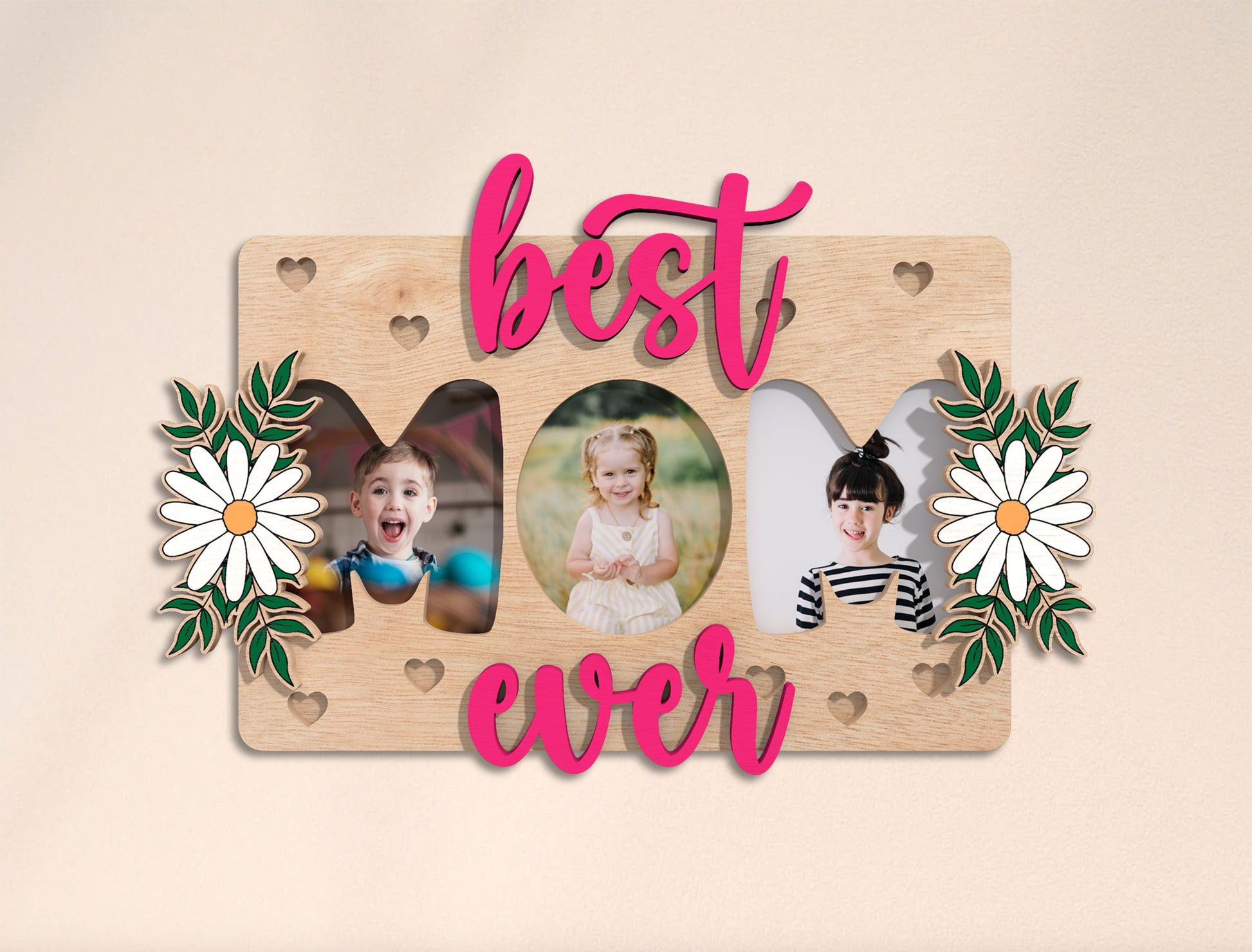 This design features a Motherās Day photo frame sign with the phrase ābest mom everā, styled with soft wooden textures, heart cutouts, and floral accents. The layout includes multiple photo openings to display children or family pictures, creating a warm and emotional keepsake made especially for moms.