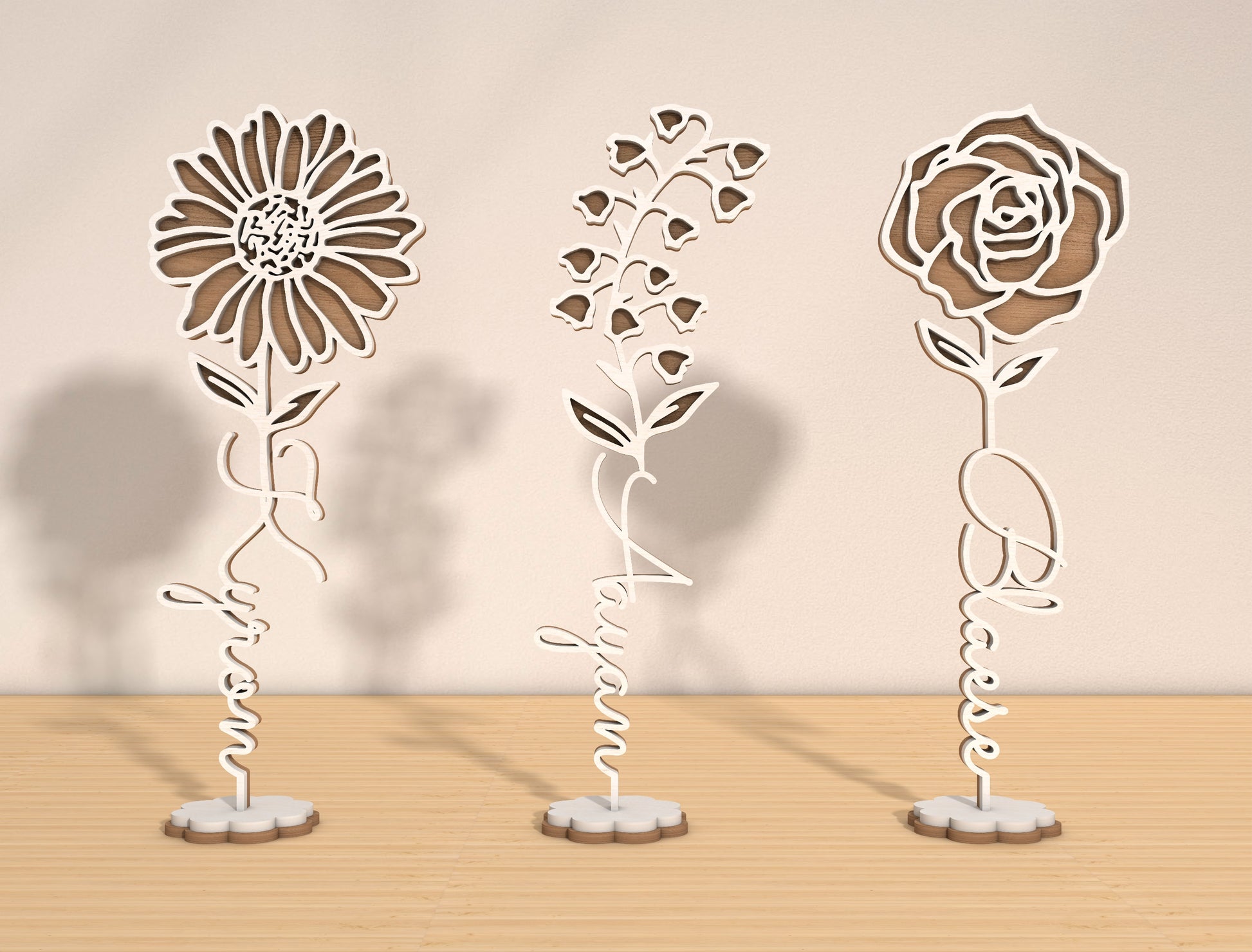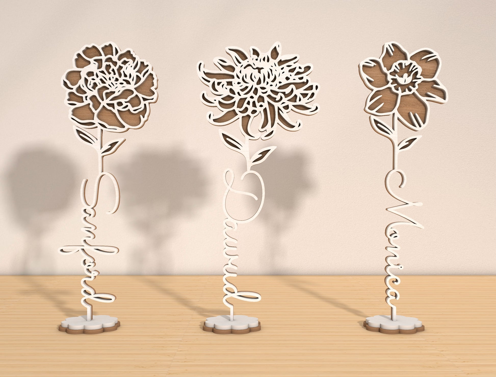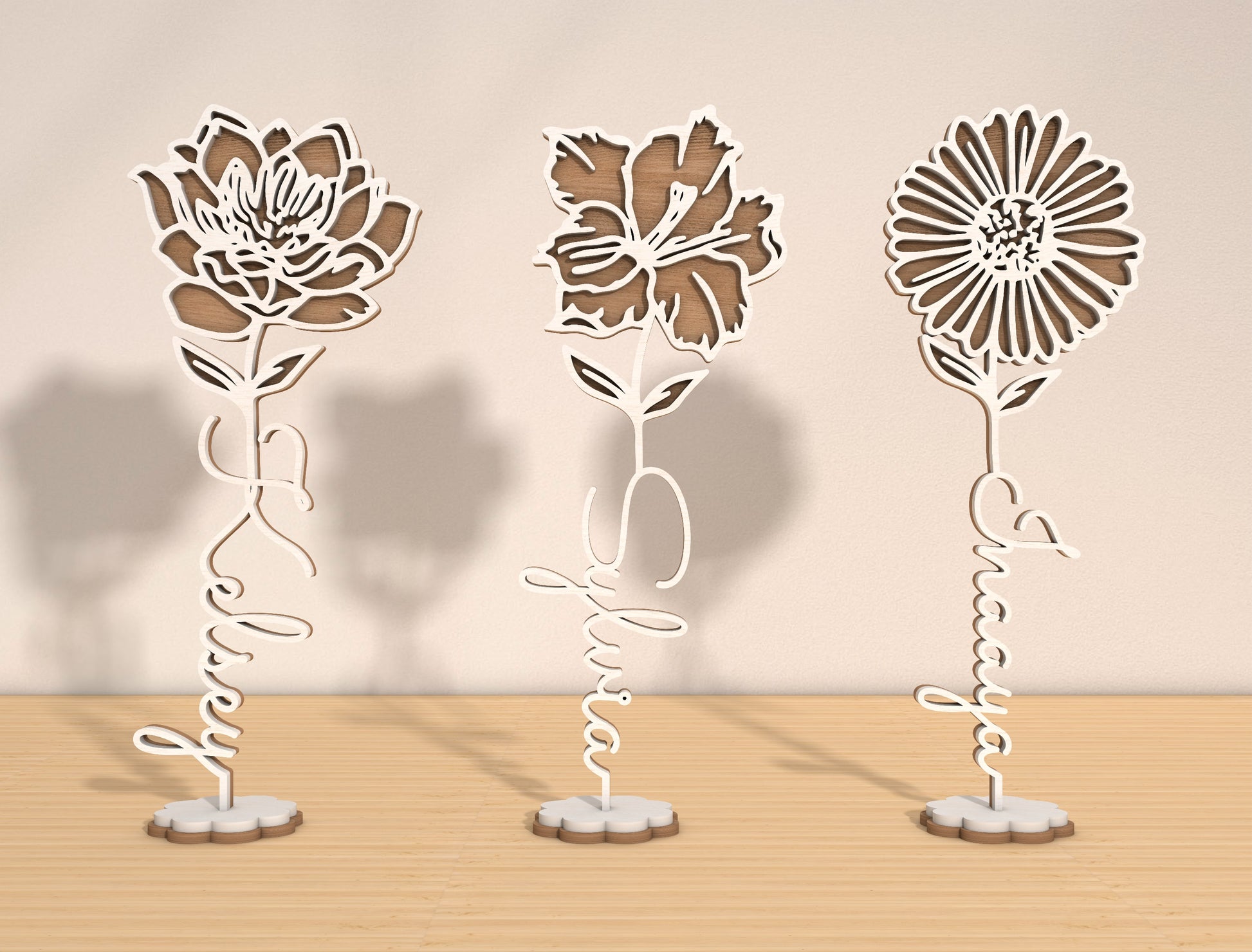 Each month features its own distinct flower shape and petal style, allowing you to match names to birth months for moms, children, or family members. The freestanding base makes these designs perfect for tabletop displays, shelves, desks, or memory corners.