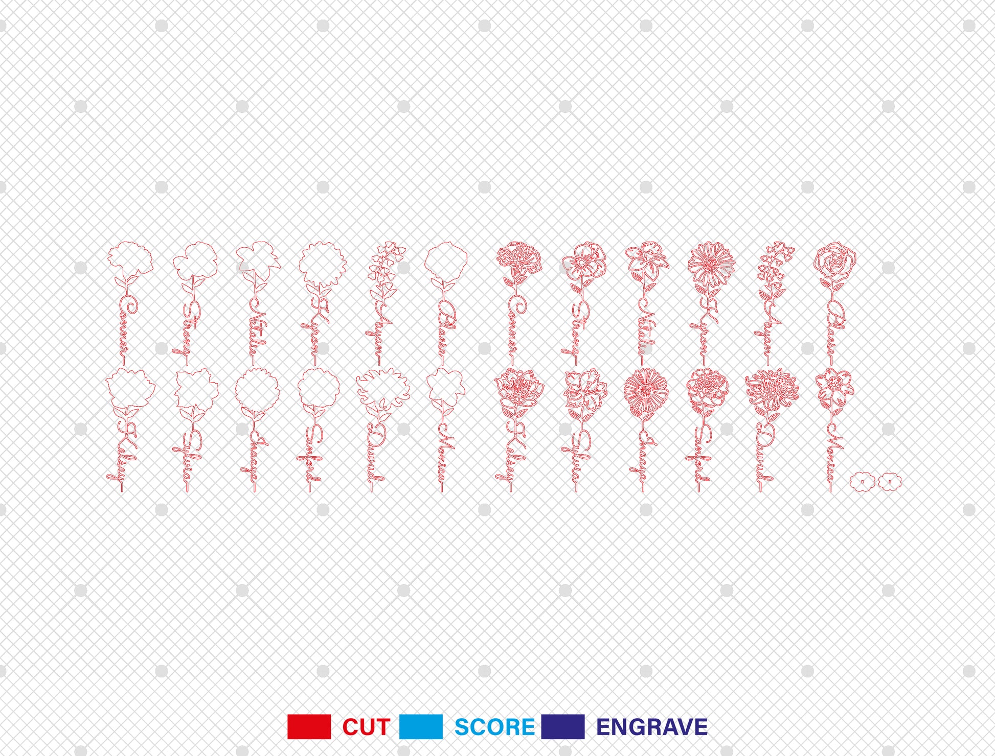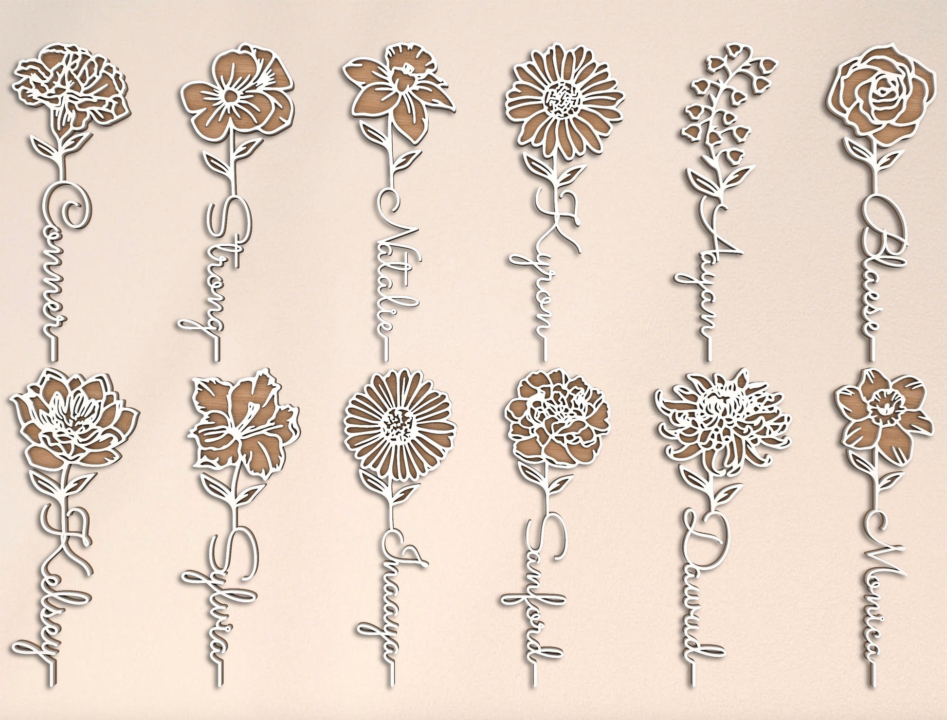 This bundle includes 12 individual designs, each representing one birth month flower, transformed into an elegant multilayer standing floral sign. Every flower is paired with a customizable name integrated directly into the flower stem, creating a deeply personal and meaningful Motherās Day keepsake.