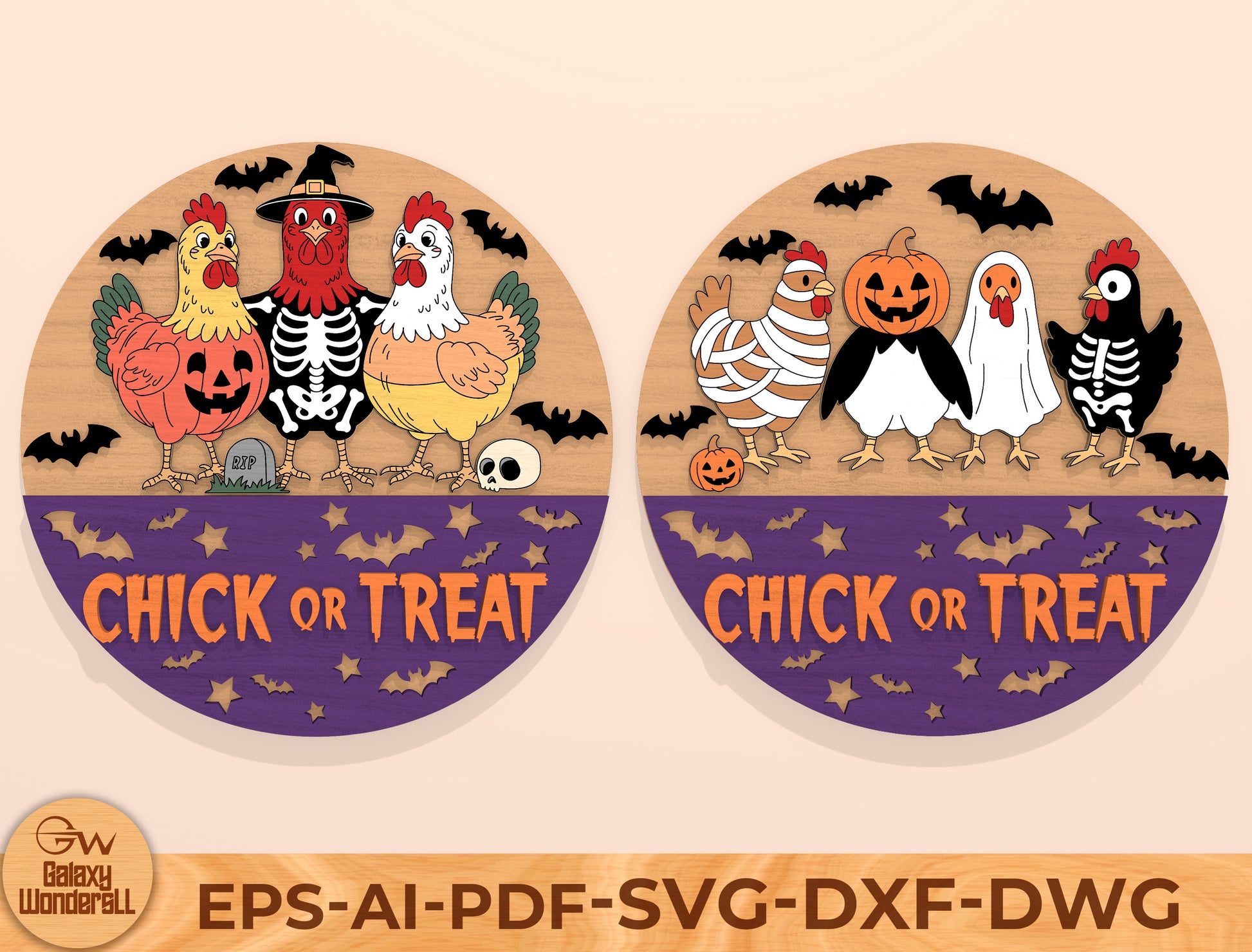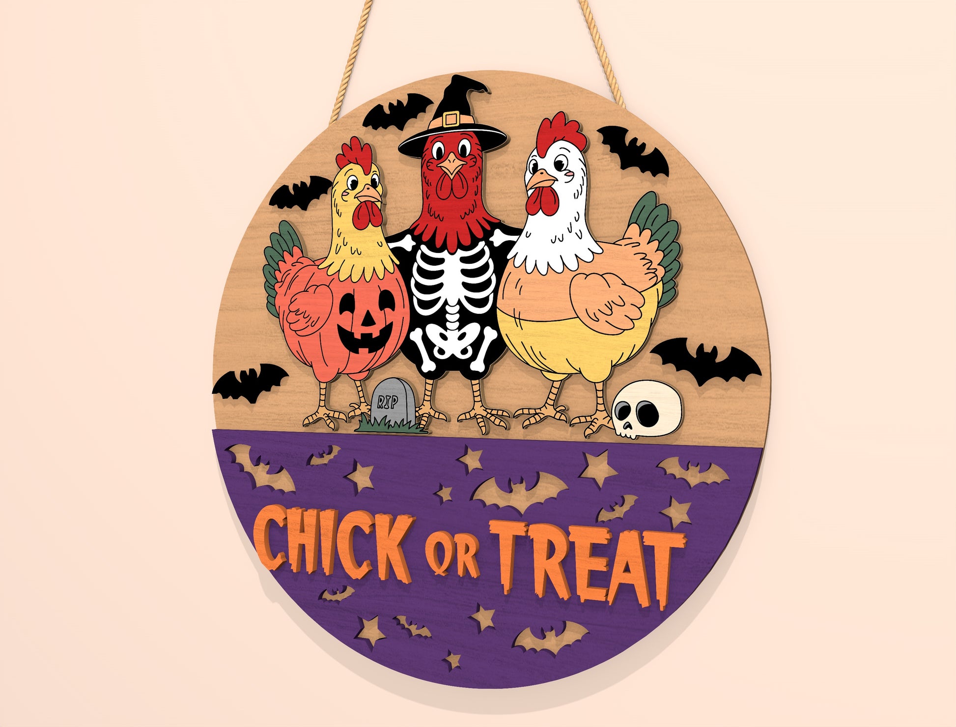 Chick or Treat Halloween Door Hanger SVG Laser Cut File | 2 Funny Chicken Designs | Round Wooden Decor | Glowforge, xTool, LightBurn, etc.