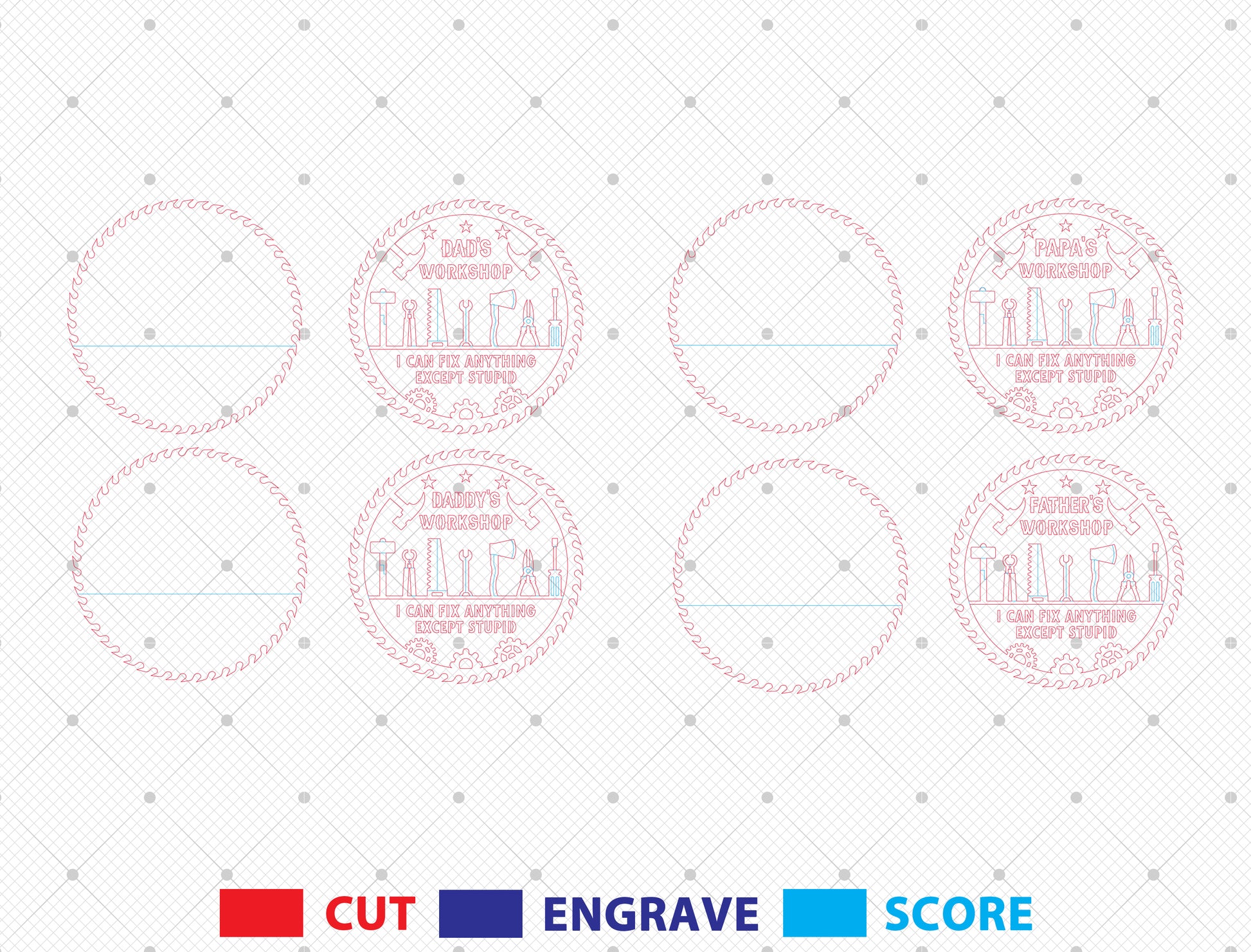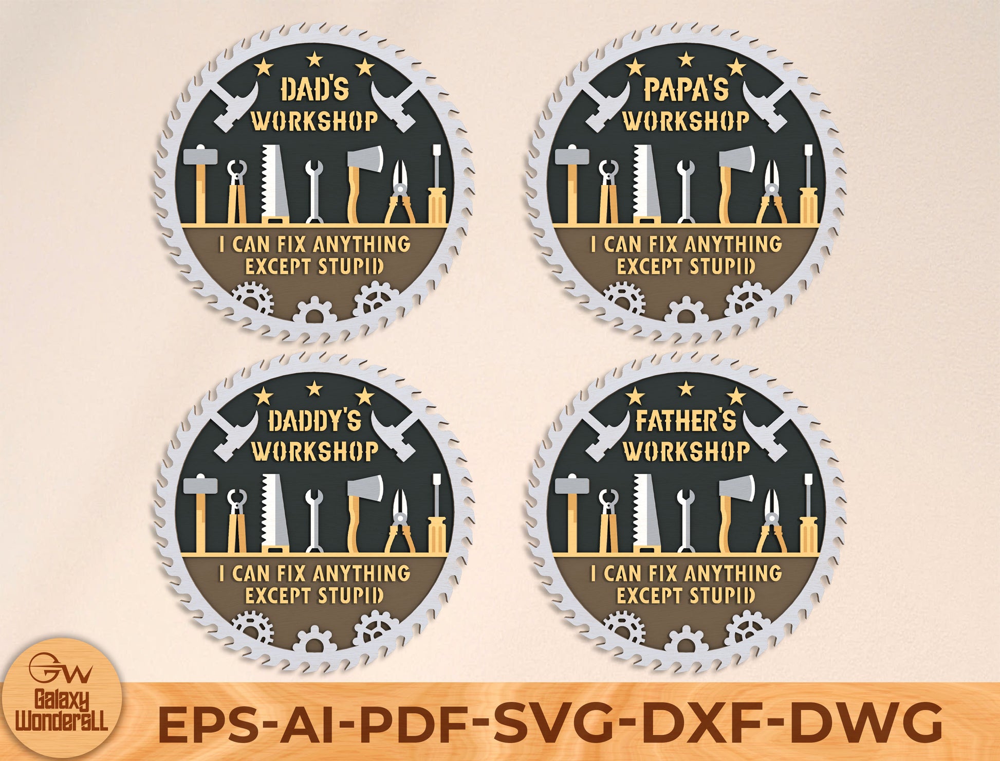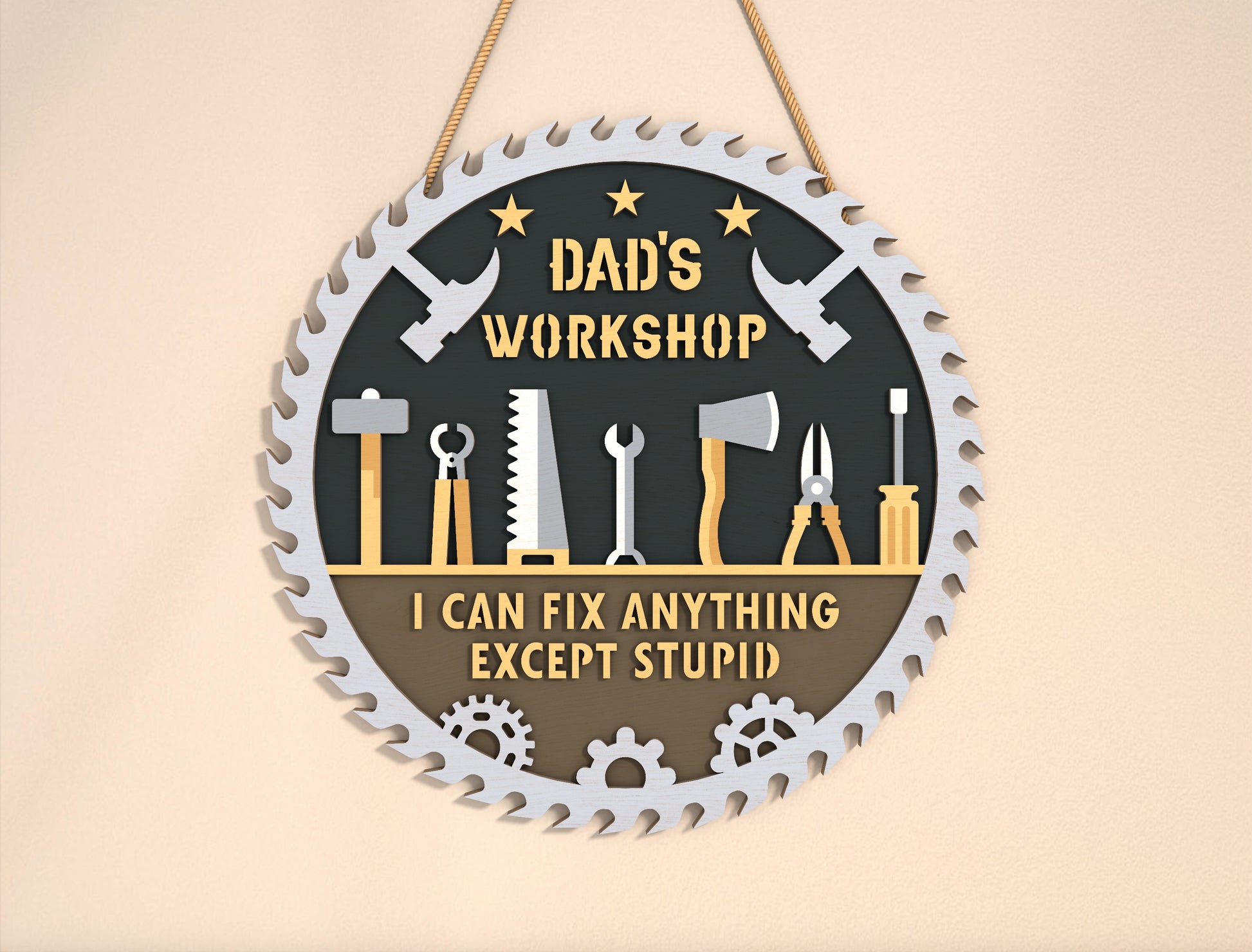 This laser cut design features a bold round workshop sign styled like a circular saw blade, filled with classic tool silhouettes and mechanical details. The design includes the visible quote “I CAN FIX ANYTHING EXCEPT STUPID”, paired with a workshop title at the top.