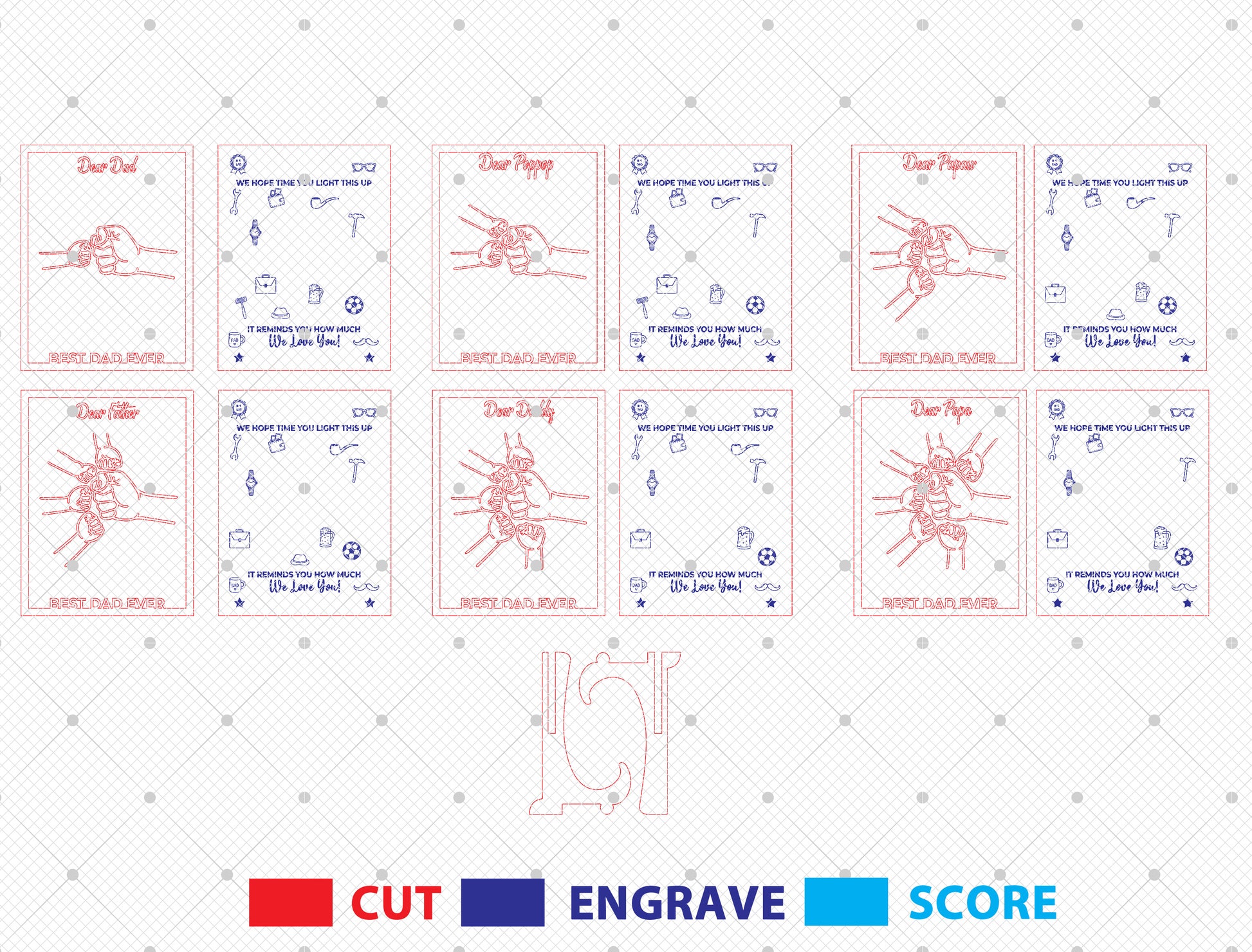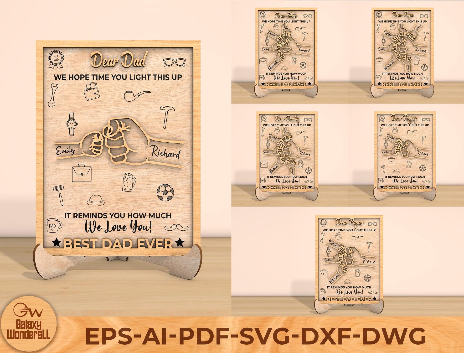 This laser cut design features a heartfelt Father’s Day standing sign with a central fist bump between a larger parent hand and smaller child hands, symbolizing love, connection, and appreciation. The design includes visible engraved text such as “Dear Dad” and “It reminds you how much we love you!”, along with a bold “Best Dad Ever” message at the bottom. Surrounding icons like tools, glasses, hats, and sports elements add a warm, everyday dad-themed touch. The design is shown with title variations such as Dad, Daddy, Papa, Popop, and Papaw.