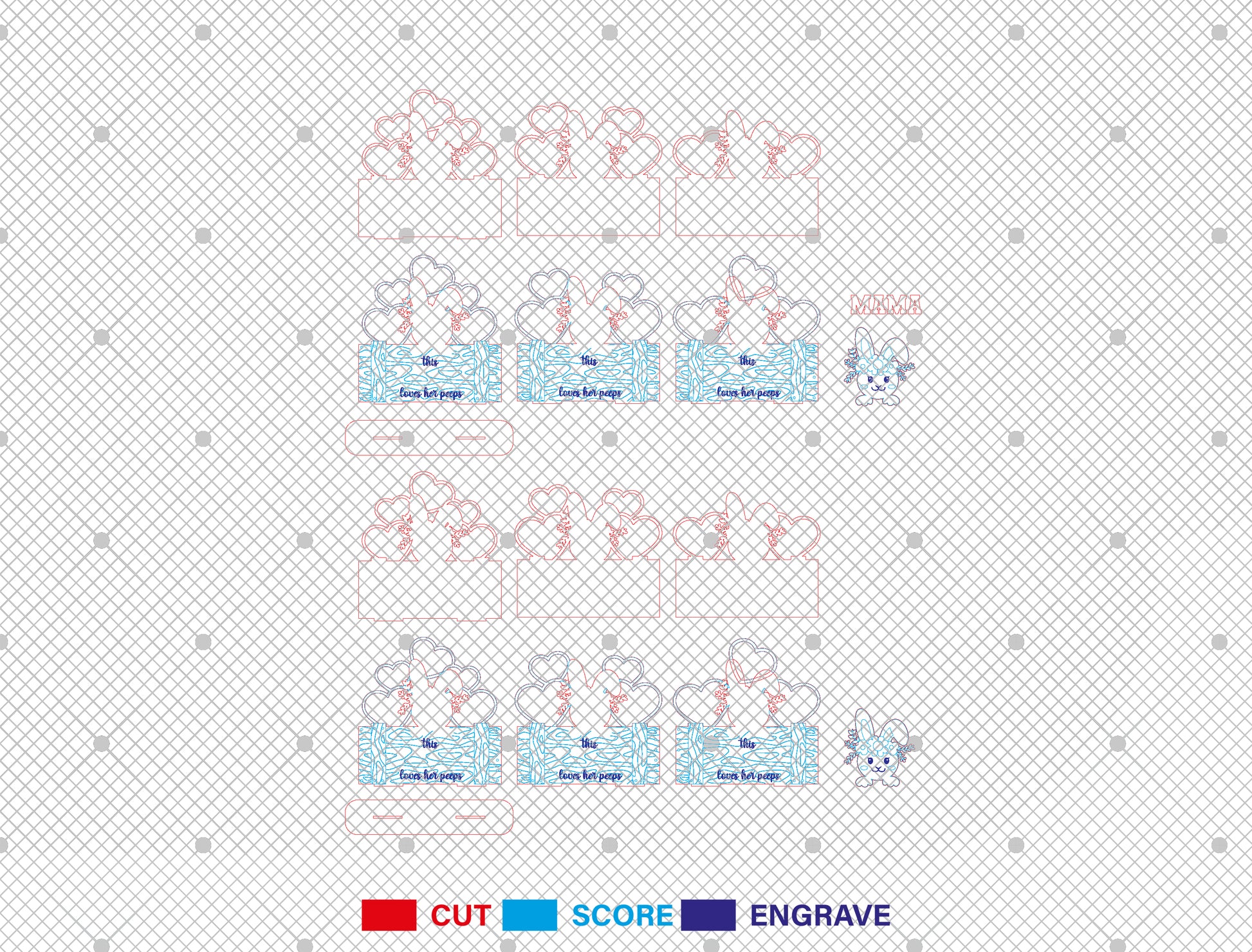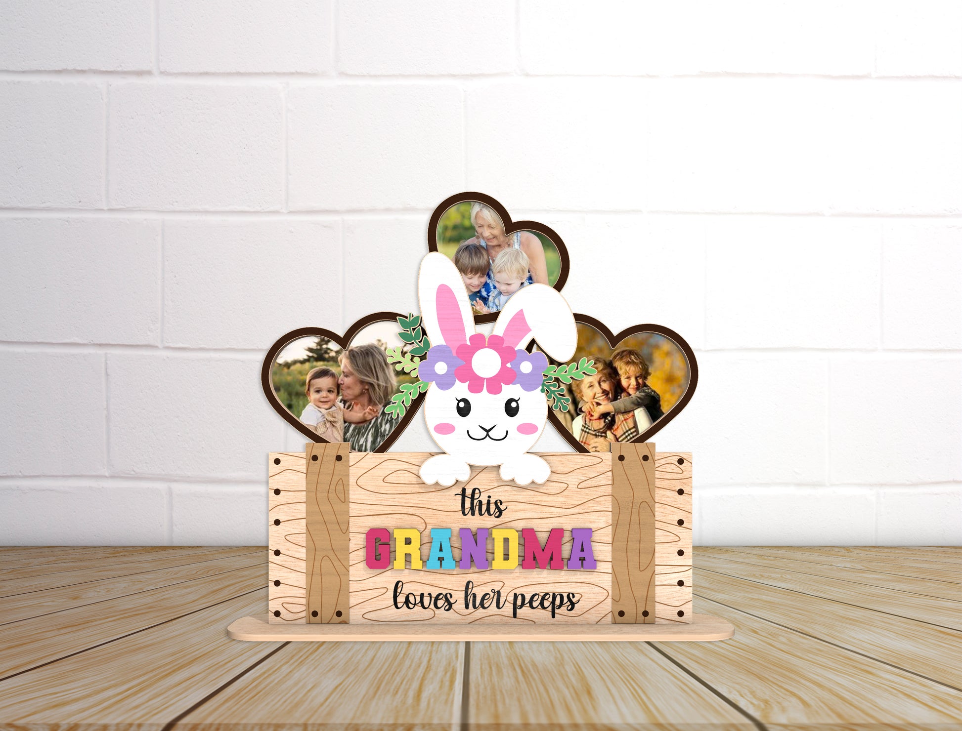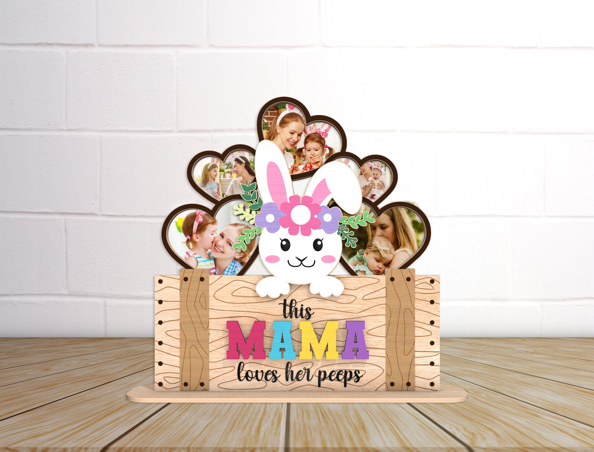 This bundle includes 2 coordinating laser cut designs, featuring an adorable Easter bunny photo frame with layered heart-shaped photo slots and a rustic wooden sign base. The designs display the visible phrases “this MAMA loves her peeps” and “this GRANDMA loves her peeps,” making them perfect for showcasing family photos during Easter and springtime celebrations.
