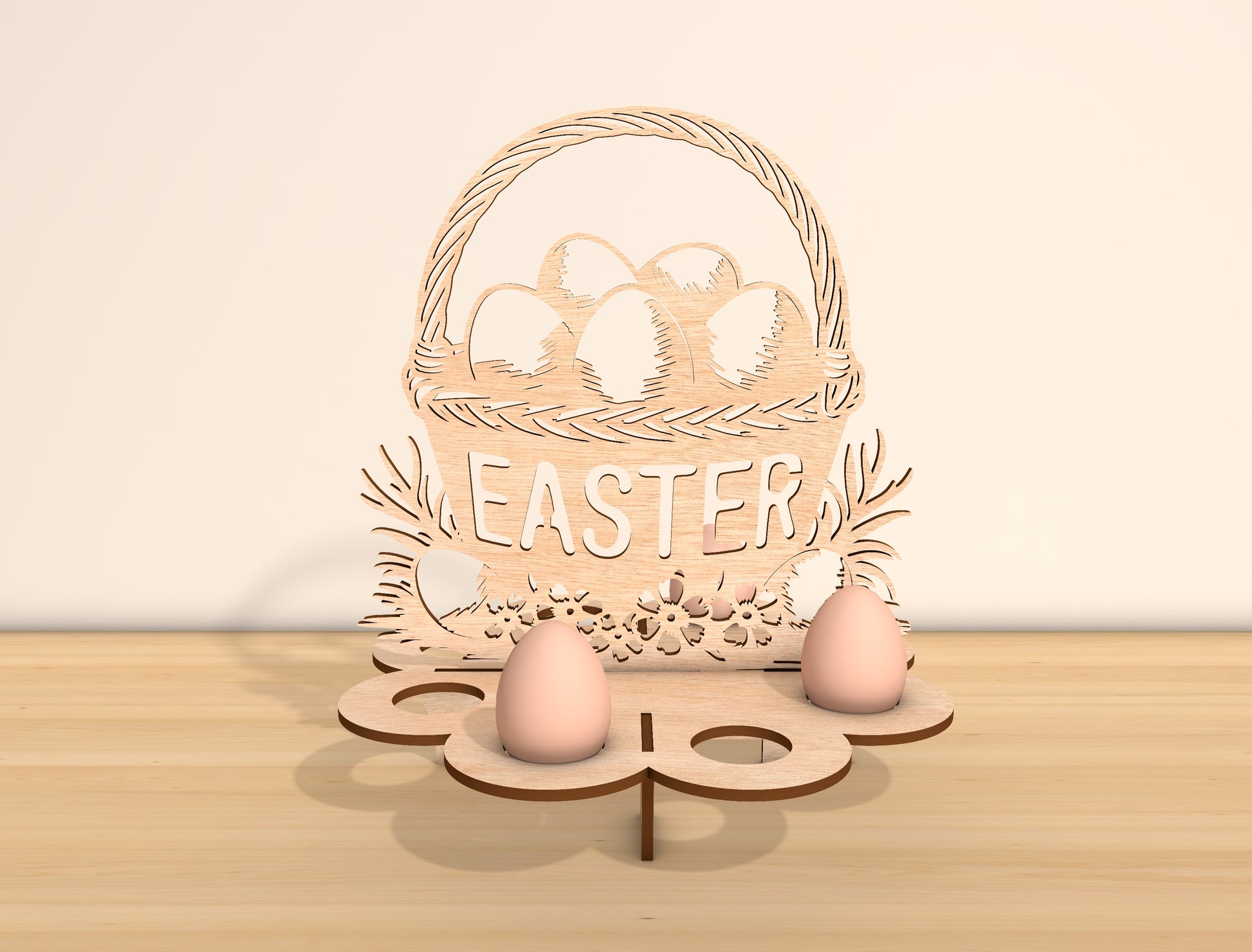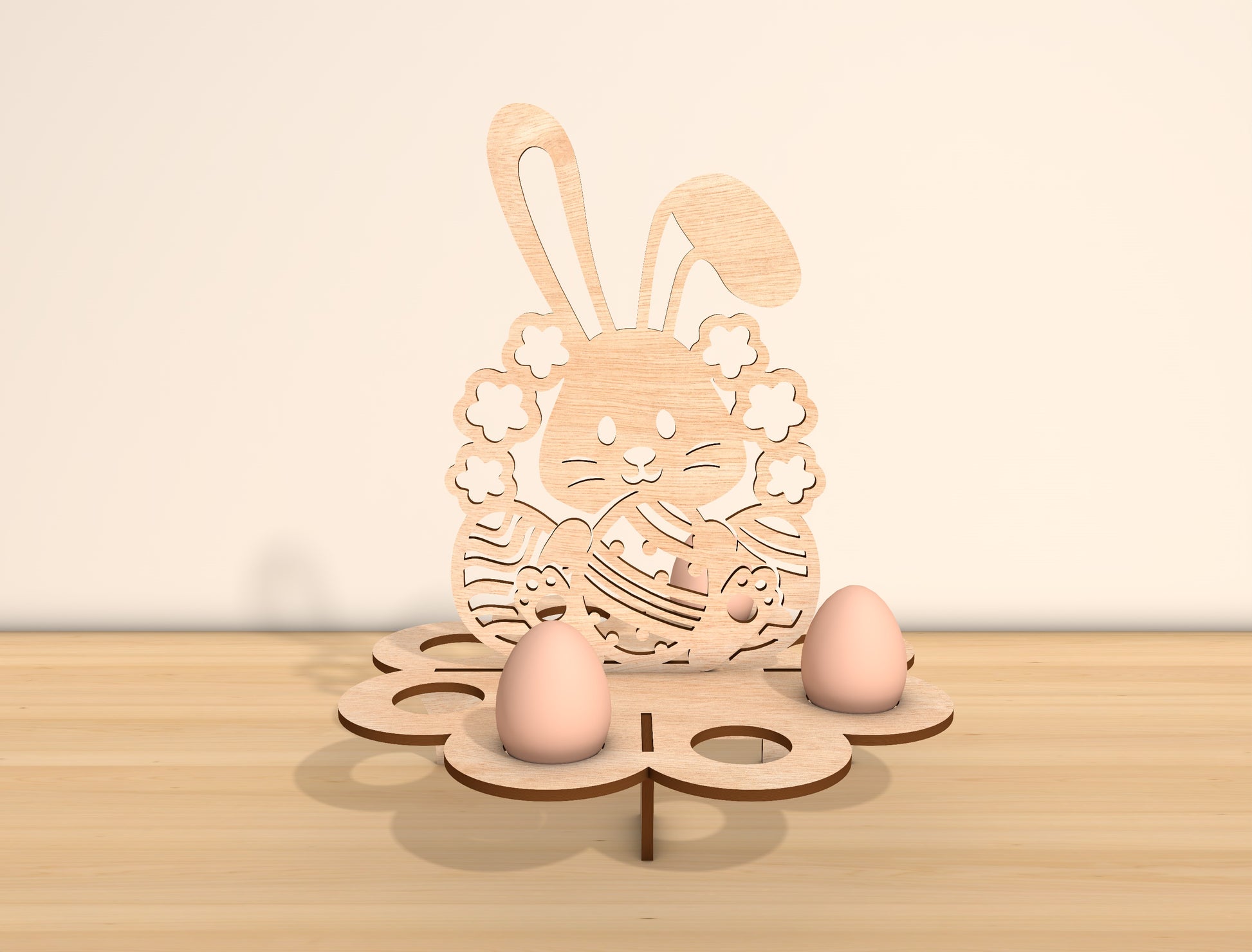 Charming Easter tabletop laser cut file featuring a round wooden egg holder stand with a cute cow silhouette holding a patterned Easter egg, surrounded by floral spring details. Designed to hold real eggs securely, this farm-style Easter decor is perfect for table centerpieces, kitchen counters, shelves, tiered trays, or rustic spring displays. Clean cut lines, balanced structure, and easy slot-together assembly.