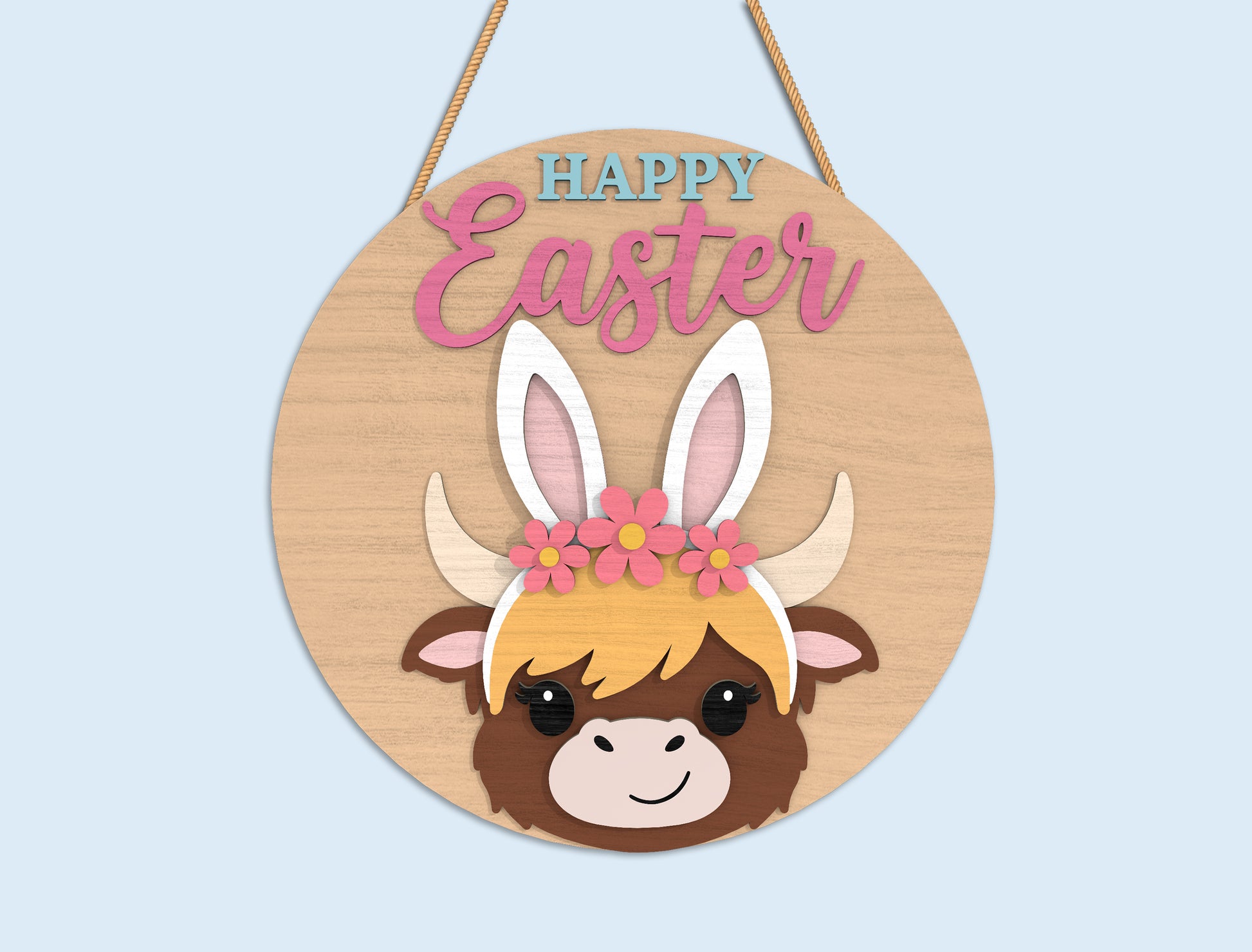 This bundle includes 9 individual round Easter door sign designs featuring cute spring characters and playful layouts. The designs showcase bunnies, a Highland cow, chicks, carrots, paw prints, florals, and colorful Easter elements. Visible phrases include “Happy Easter,” “Hello Bunnies,” “Welcome,” “Hello Peeps,” and “Hop On In,” creating a cheerful and family-friendly spring decor set.