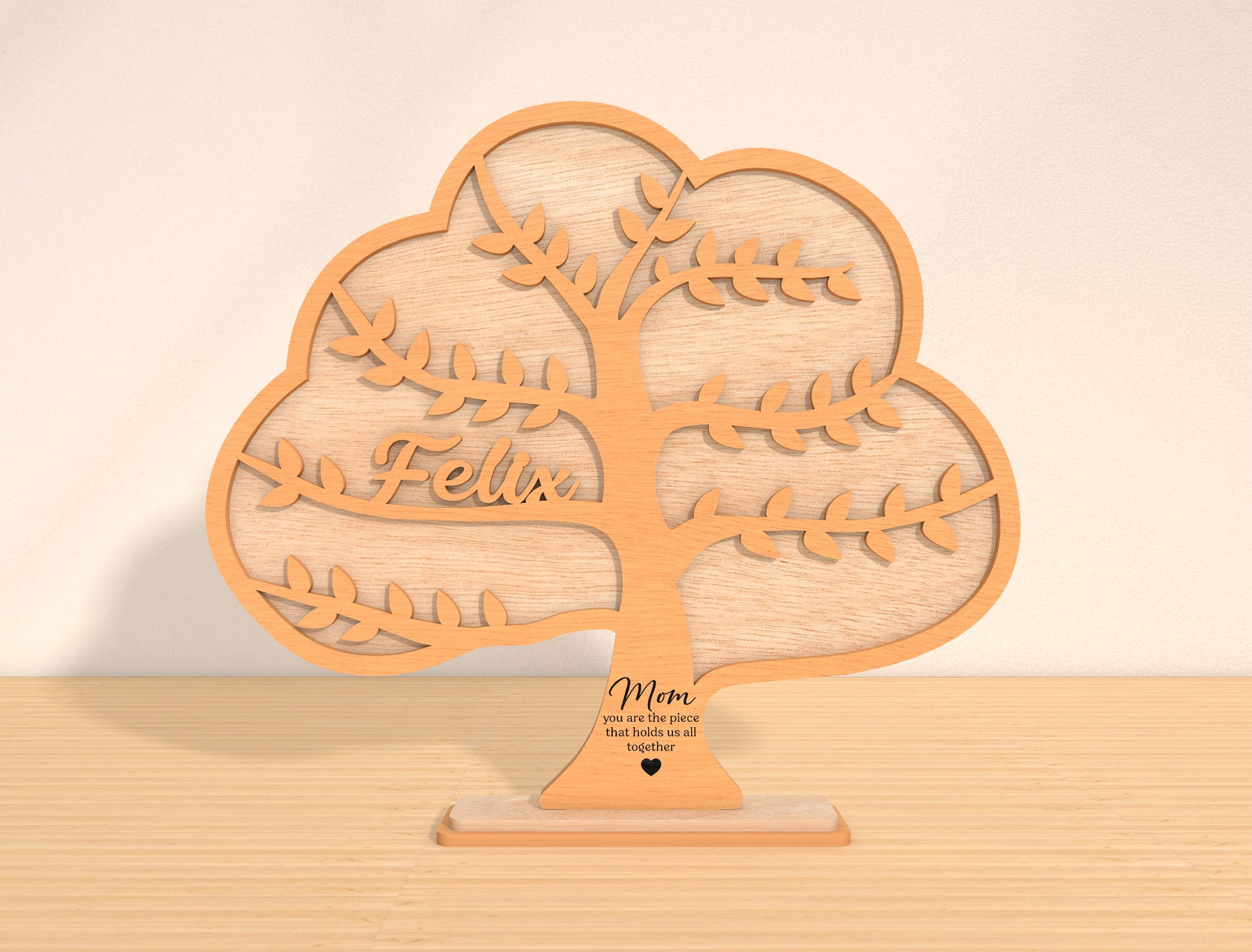 This laser cut design features a beautifully layered family tree with branch-style name placements, creating a meaningful keepsake for moms and families. The sturdy trunk and flowing branches symbolize connection and love, finished with the heartfelt message “Mom you are the piece that holds us all together”, making it perfect for Mother’s Day or year-round family decor.