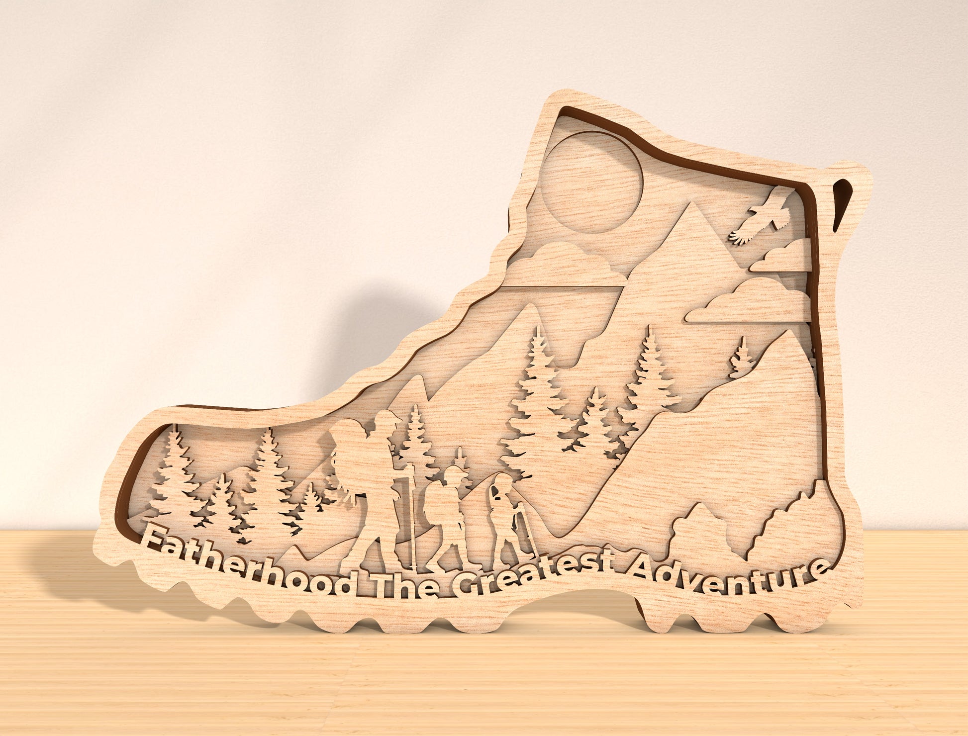 This laser cut design features a powerful fatherhood adventure scene shaped as a layered mountain silhouette. The artwork shows a father hiking with children through pine forests and mountain peaks, under a bright sun and open sky. The engraved quote āFatherhood The Greatest Adventureā is integrated along the base of the design, reinforcing the theme of family, guidance, and shared journeys. The layered landscape style creates depth and a strong outdoor, adventure-inspired look.