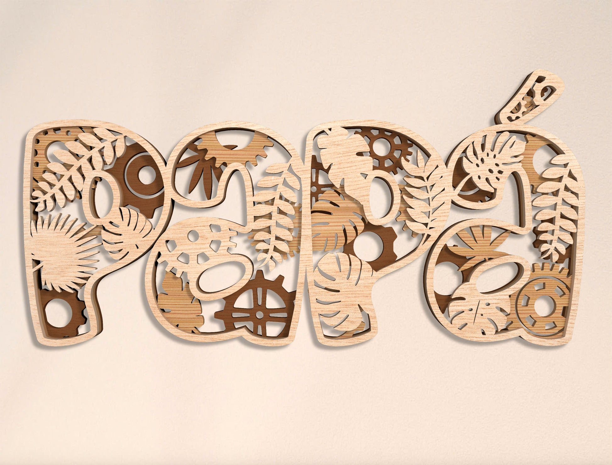 This bundle includes 6 individual designs featuring Father’s Day–themed dad words in different languages, presented as bold layered lettering filled with botanical leaves and subtle mechanical-style cutouts. Each word design is crafted as a standalone piece, making this set perfect for celebrating dads, fathers, and father figures with meaningful handmade decor.