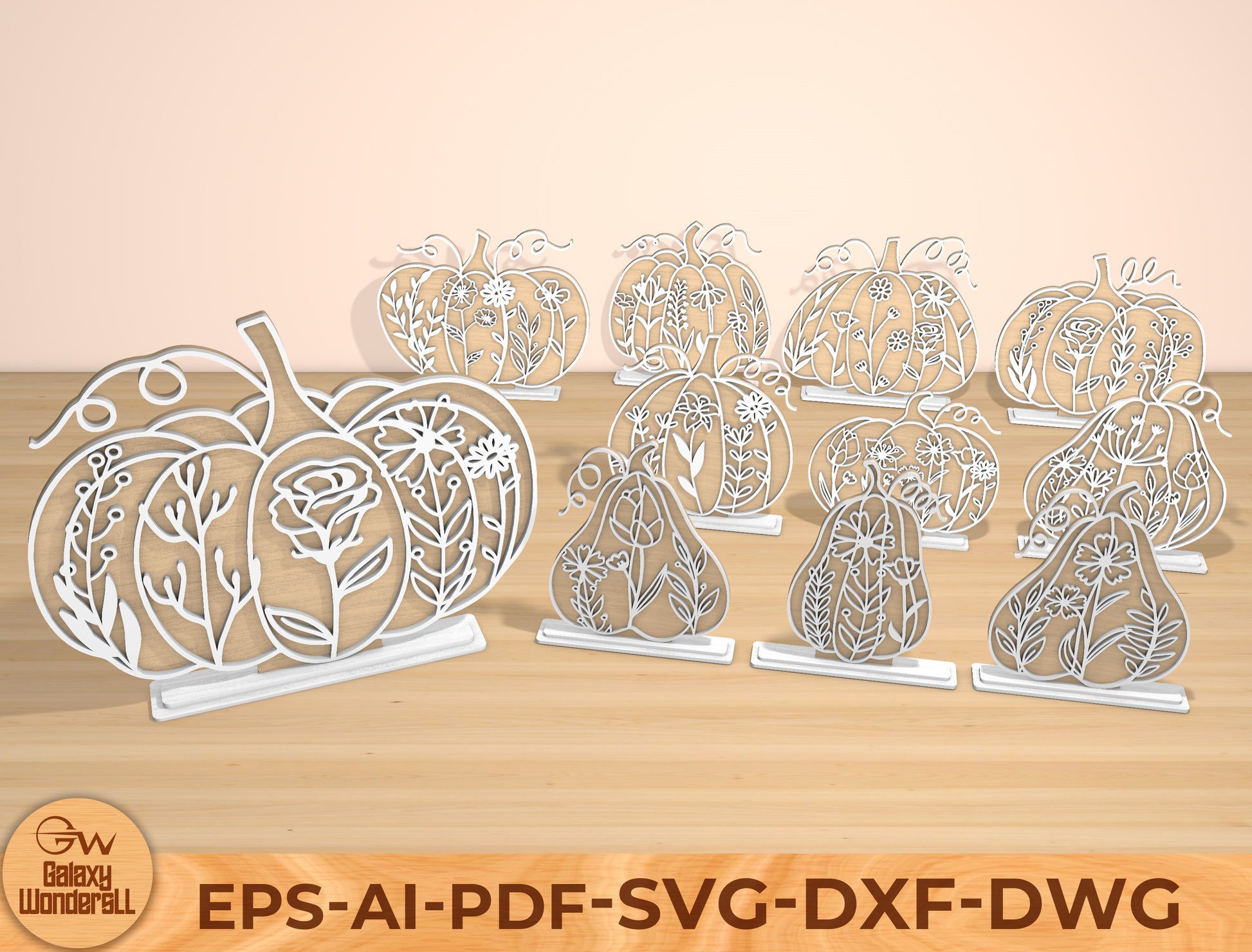 This bundle includes 11 individual pumpkin and gourd tabletop designs, featuring elegant fall shapes decorated with delicate floral and botanical cutout patterns. The collection combines pumpkins and pear-shaped gourds in a refined, nature-inspired style that works beautifully for autumn, harvest, and Thanksgiving decor.