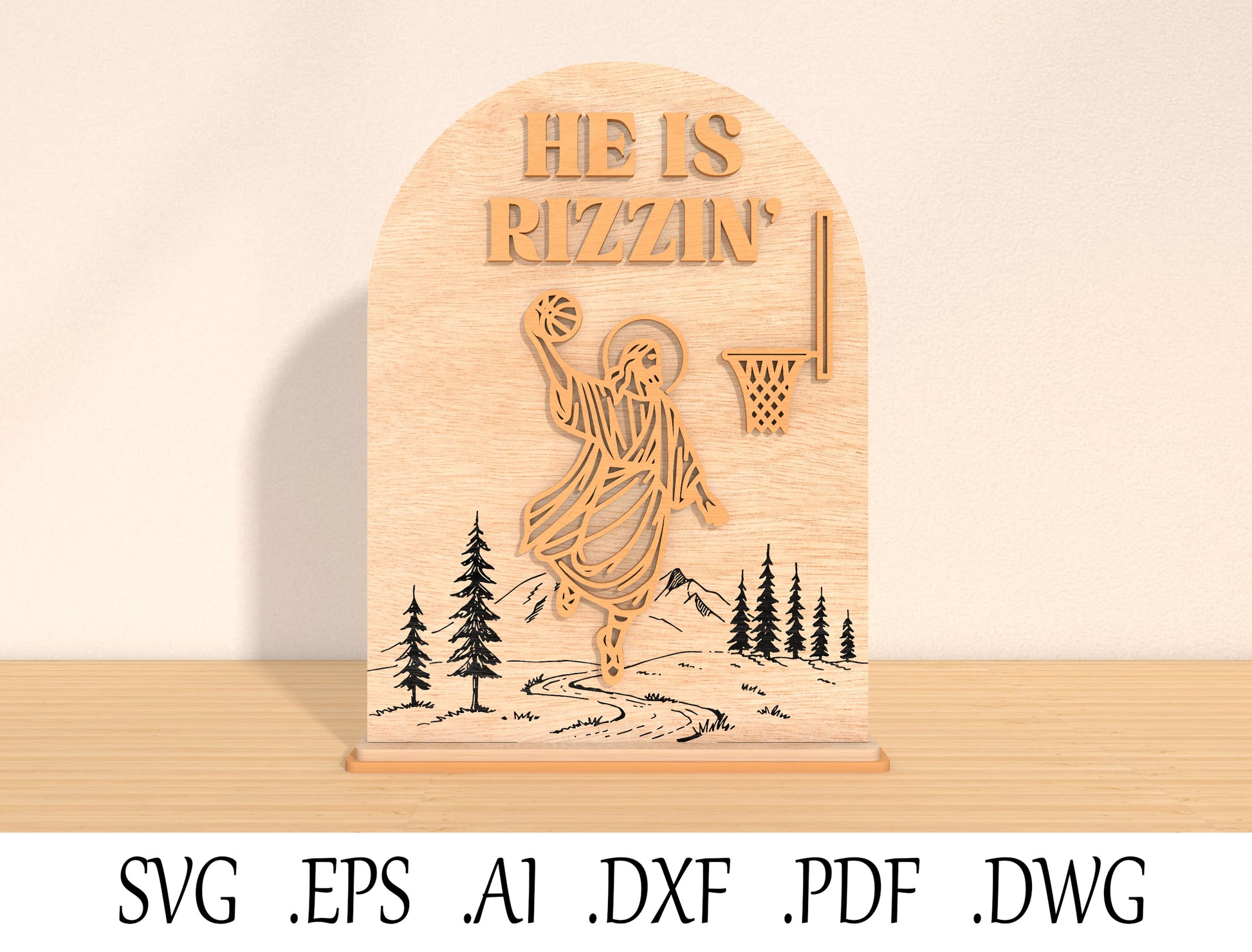 He Is Rizzin’ Laser Cut File | Funny Faith Basketball Decor | Modern Wooden Sign | Glowforge, xTool, LightBurn, etc.