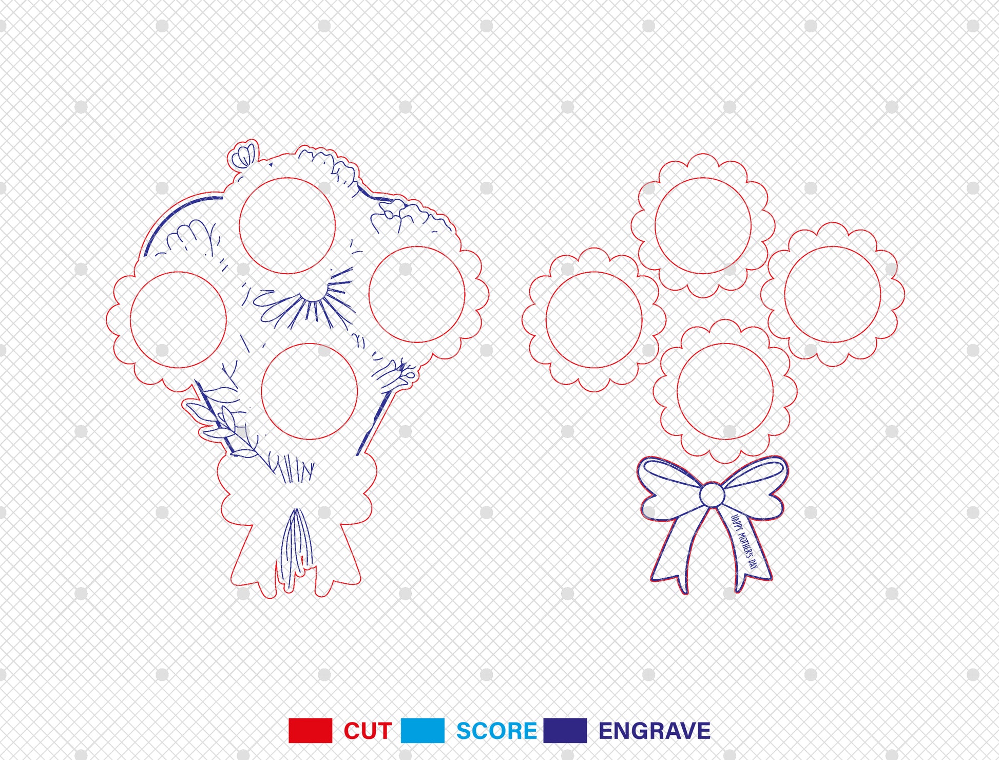 This laser cut design features a bouquet-style photo frame created especially for Mother’s Day, with layered floral shapes designed to hold multiple circular photos. Each flower acts as an individual photo holder, arranged like a hand-tied bouquet and finished with a decorative bow, creating a warm and emotional display of children or family memories.