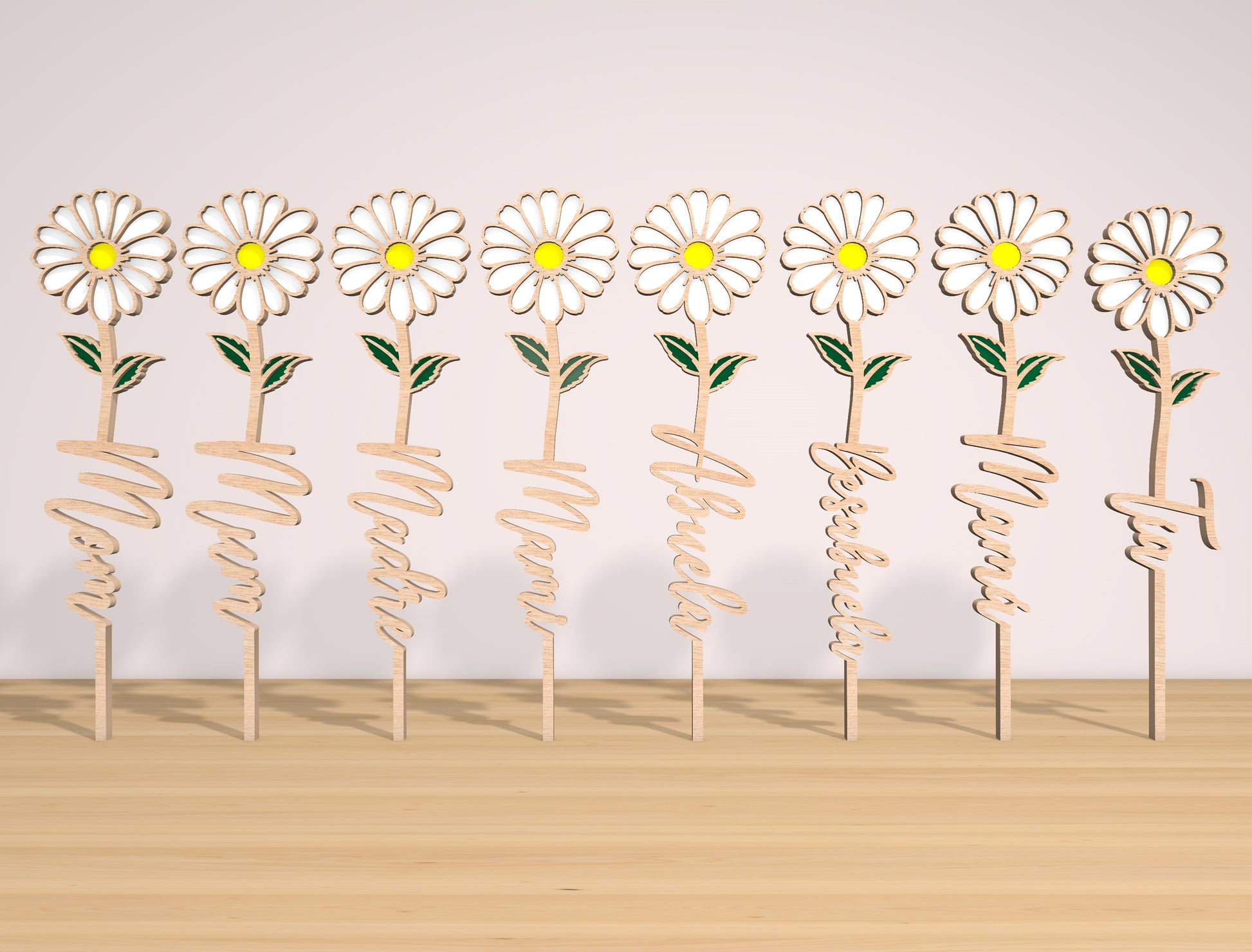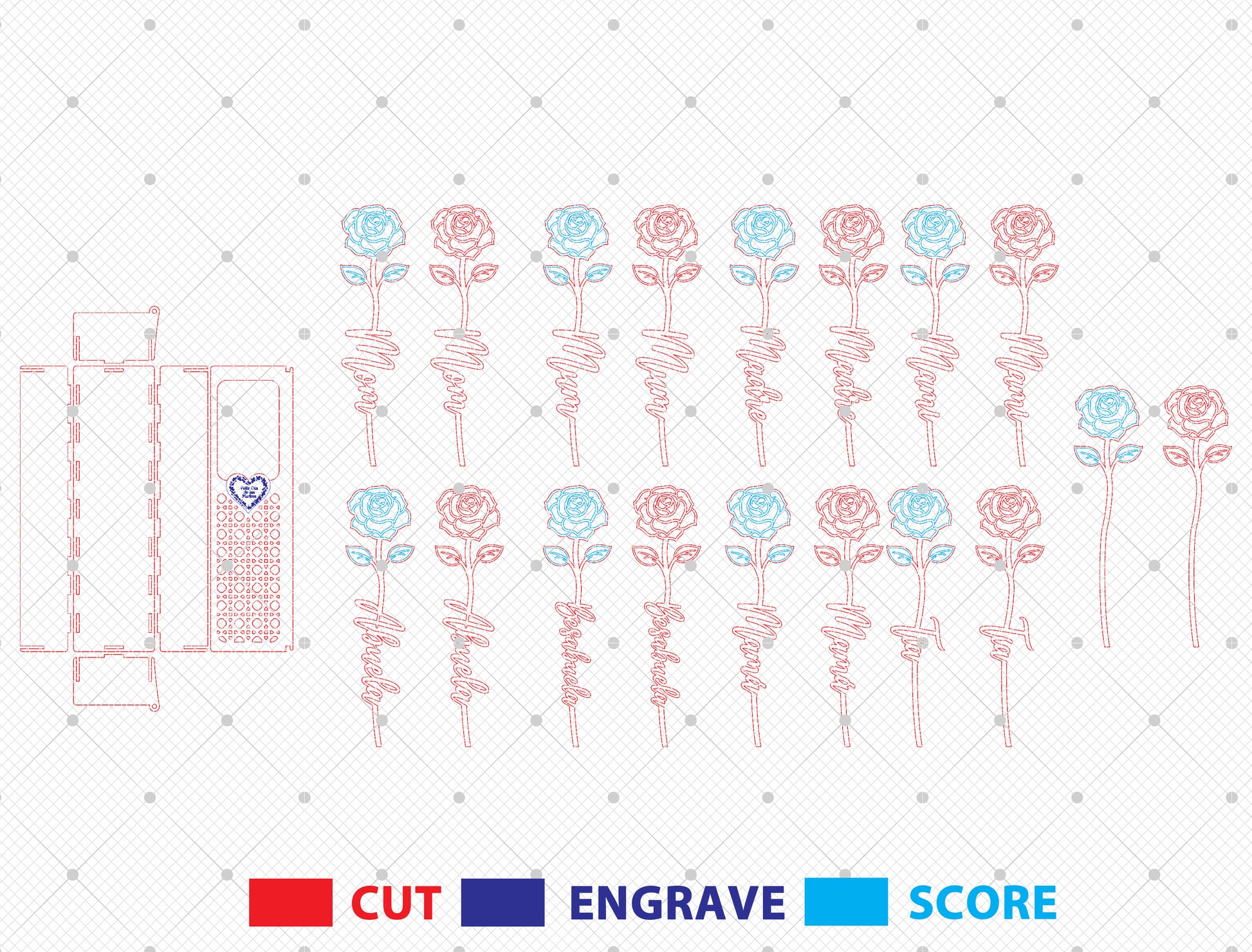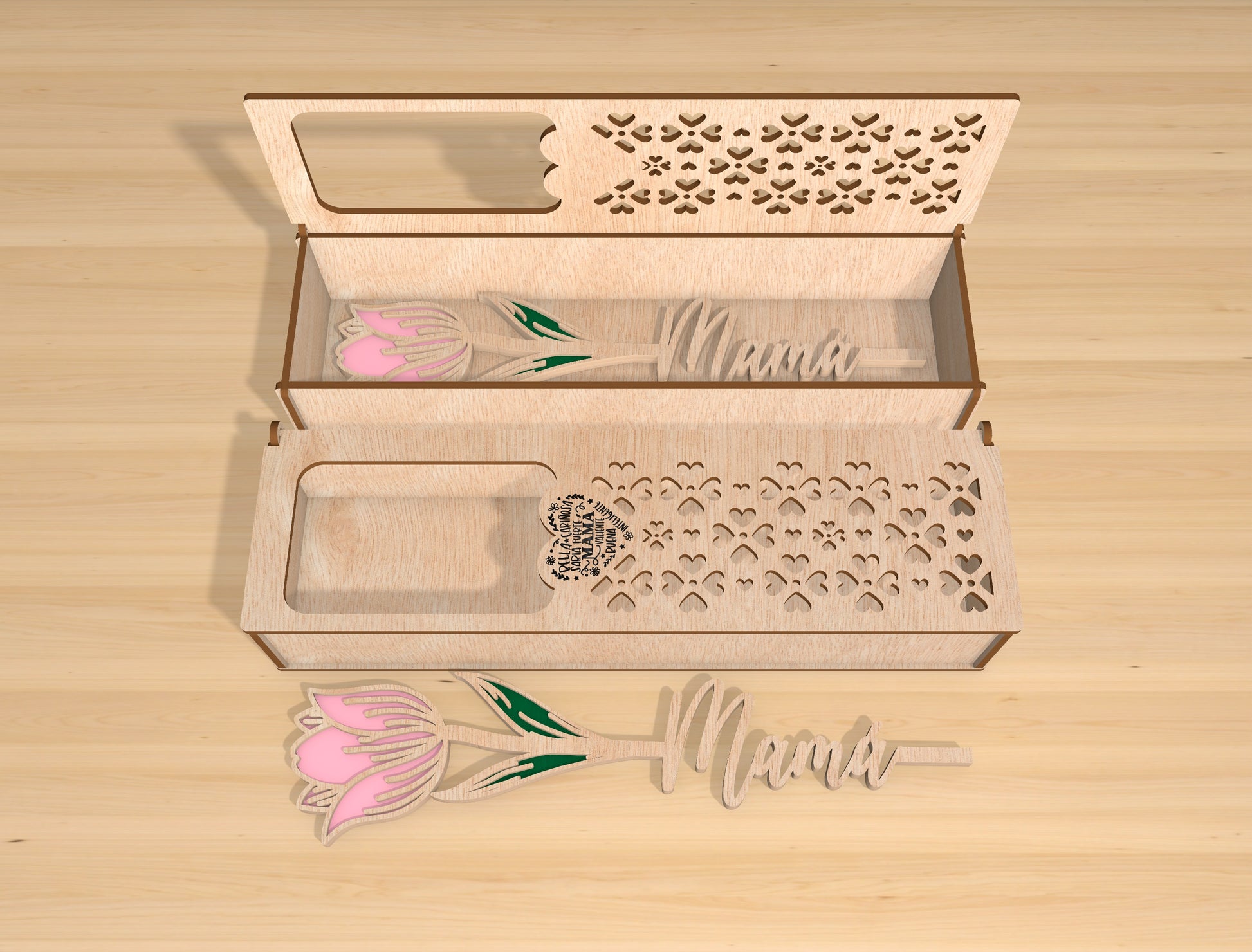 This bundle includes 4 individual designs featuring a multilayer wooden gift box paired with a floral word insert. Each design showcases a different flower style and matching decorative box pattern, creating a heartfelt Motherās Day keepsake concept. The floral insert slides perfectly into the box, making it ideal for surprise gifts, memory keepsakes, or decorative storage with an elegant handcrafted look.