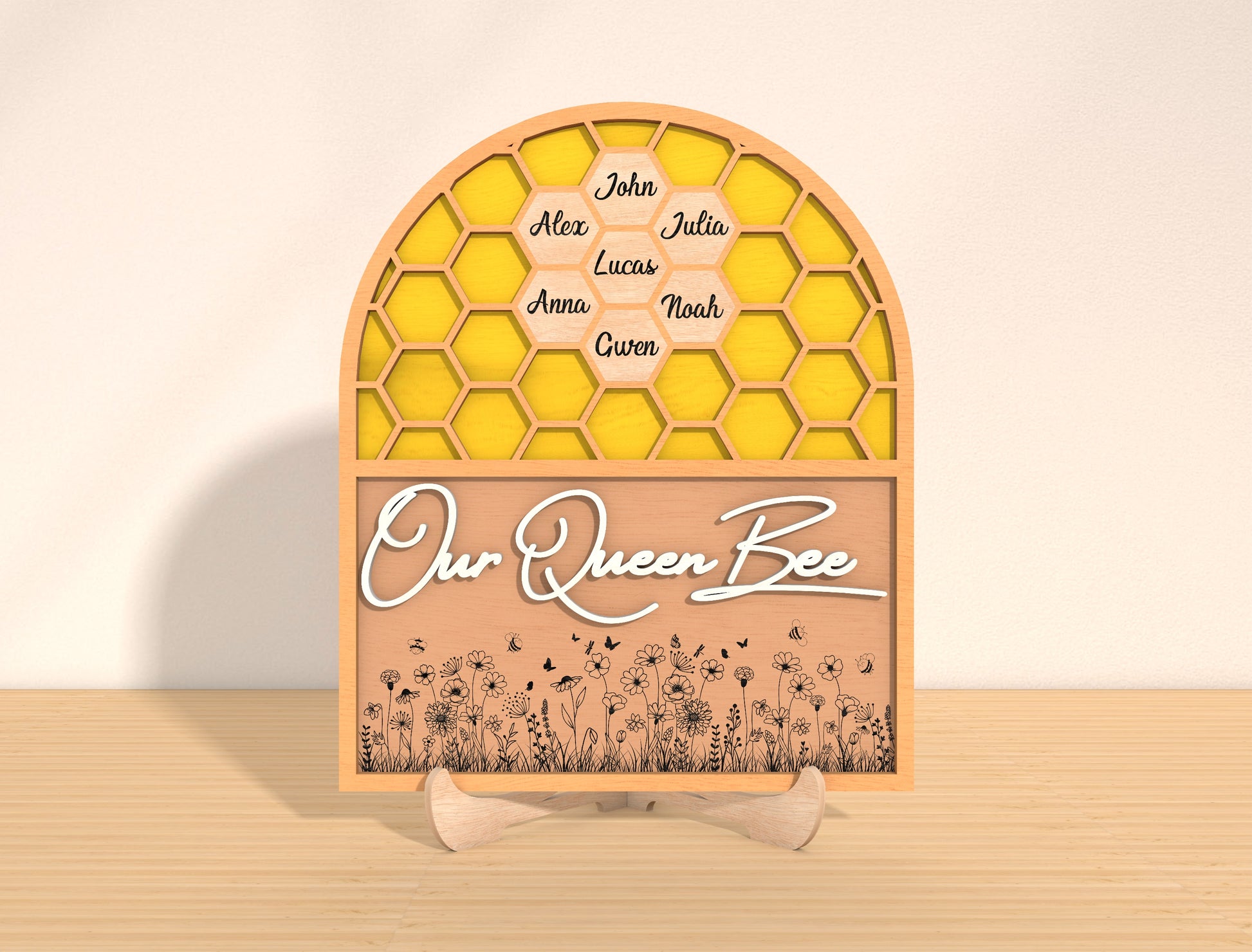 This laser cut design features a Mother’s Day “Our Queen Bee” honeycomb sign, personalized with 3 to 15 custom names placed inside individual hexagon cells. The arched honeycomb layout symbolizes family unity, with each name representing a loved one gathered around mom as the queen of the hive.