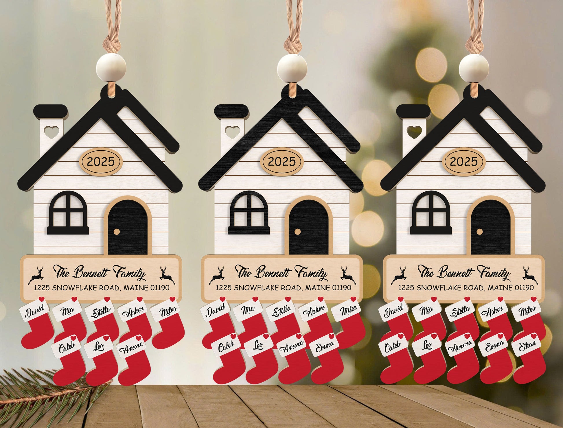 Create a meaningful Christmas family ornament with this house-shaped laser cut file. Designed with hanging stockings for each family member, year plaque, and name panel, perfect for personalized holiday decor, gifts, and DIY Christmas projects.