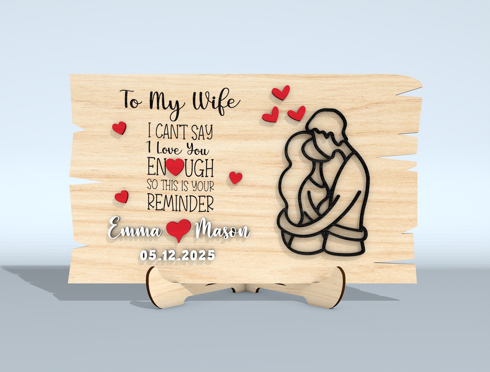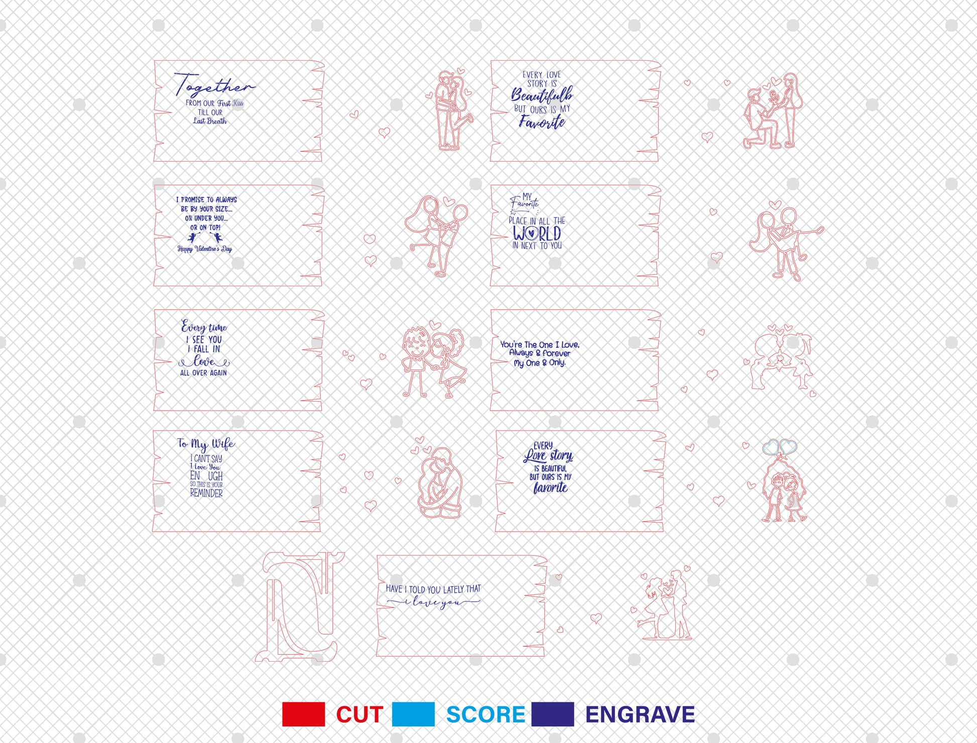 This bundle includesĀ 9 individual laser cut designs, featuring romantic couple silhouettes, hand-drawn figures, and love-themed illustrations paired with heartfelt engraved quotes. The designs are styled as rustic wooden plaques with decorative edges, name personalization, and date details, making them ideal for Valentineās Day, anniversaries, weddings, or everyday romantic home decor. One featured quote reads āI canāt say I love you enough, so this is your reminder.ā