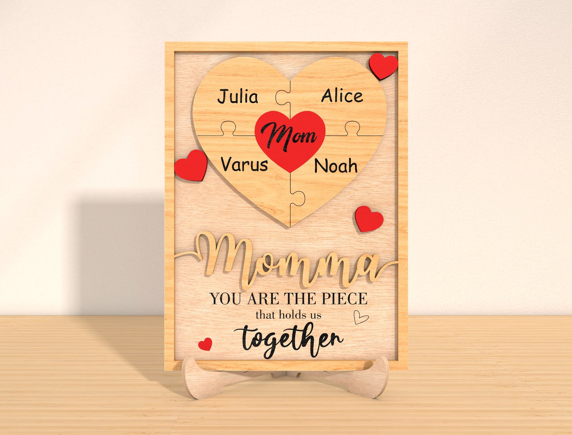 The design includes a wooden frame, layered heart puzzle elements, and engraved text reading āYou are the piece that holds us togetherā, making it a meaningful decorative piece for Motherās Day, birthdays, or family gifts. The layout is carefully balanced so all names remain clear, readable, and visually harmonious.