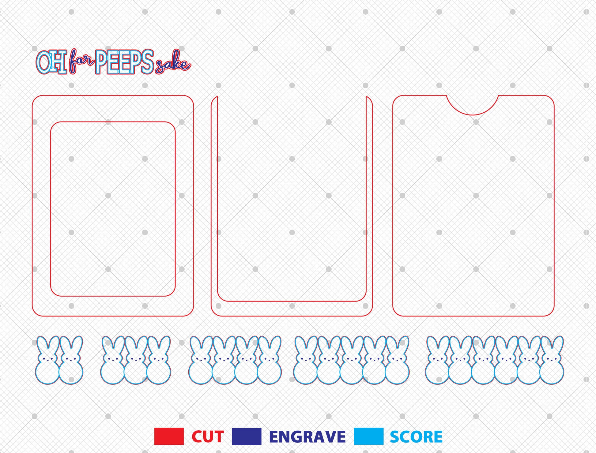 This personalized laser cut file features a fun Easter photo frame design with the phrase “Oh for peeps sake” at the top and a row of bunny shapes along the bottom. Each bunny represents one family member, allowing the design to be customized based on family size. The layout includes a central photo opening, layered pastel bunny figures, and a clean wooden frame style perfect for spring and Easter decor.