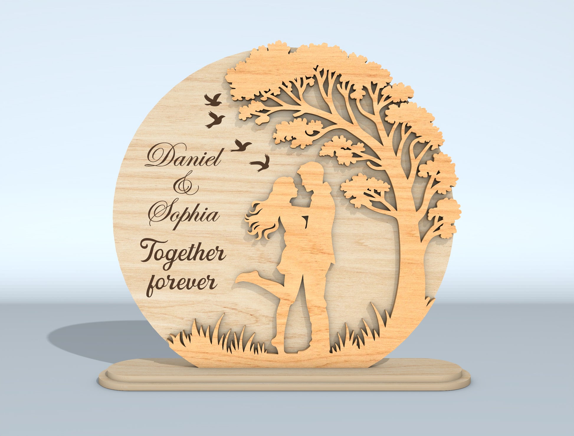 This bundle includes 6Ā individual laser cut designs, featuring romantic couple silhouettes set within elegant circular frames, heart motifs, tree scenes, and nature-inspired compositions. Several designs include engraved love quotes such as āLike the moonlight, our love shines,ā āTogether forever,ā and āForever and always,ā along with customizable names for a truly meaningful keepsake. Perfect for weddings, anniversaries, Valentineās Day, or sentimental home decor.