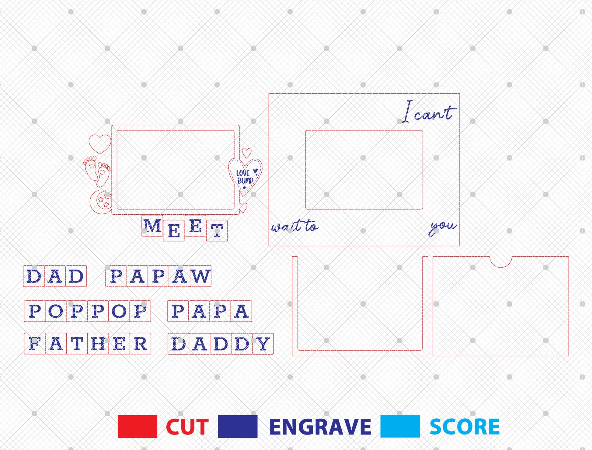 This bundle includes 6 individual laser cut frame designs created for pregnancy announcements and keepsake decor. Each design features a square tabletop photo frame layout with baby-themed elements such as footprints, hearts, moons, and the visible phrase “I can’t wait to meet you.” The top title varies by design and includes different father names such as Papa, Daddy, Dad, Father, Papaw, and PopPop, allowing you to choose the version that fits your family.