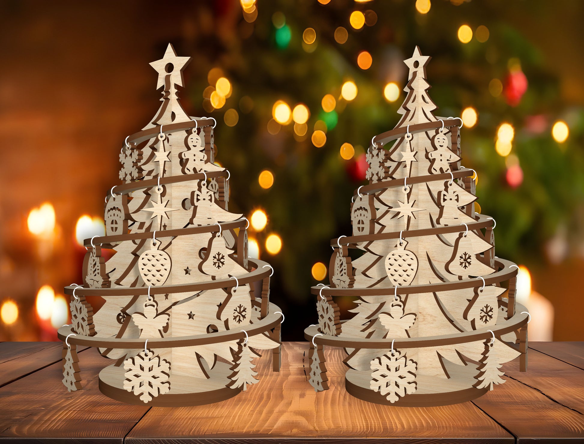 Create a beautiful Christmas tabletop decor with this layered Christmas tree laser cut file. Featuring a multi-tier tree design with hanging ornaments, perfect for festive displays, shelf decor, and DIY holiday projects.