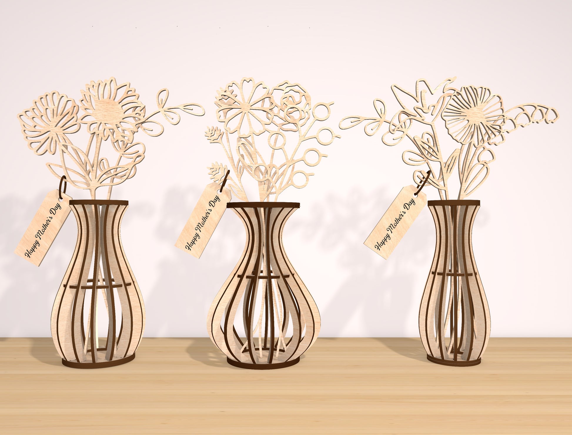 The designs are ideal for creating custom flower displays, tabletop decor, seasonal styling, Mother’s Day gifts, and handmade wooden accents. The flower stems can be mixed and matched freely, allowing endless design combinations while using the same vase structure.