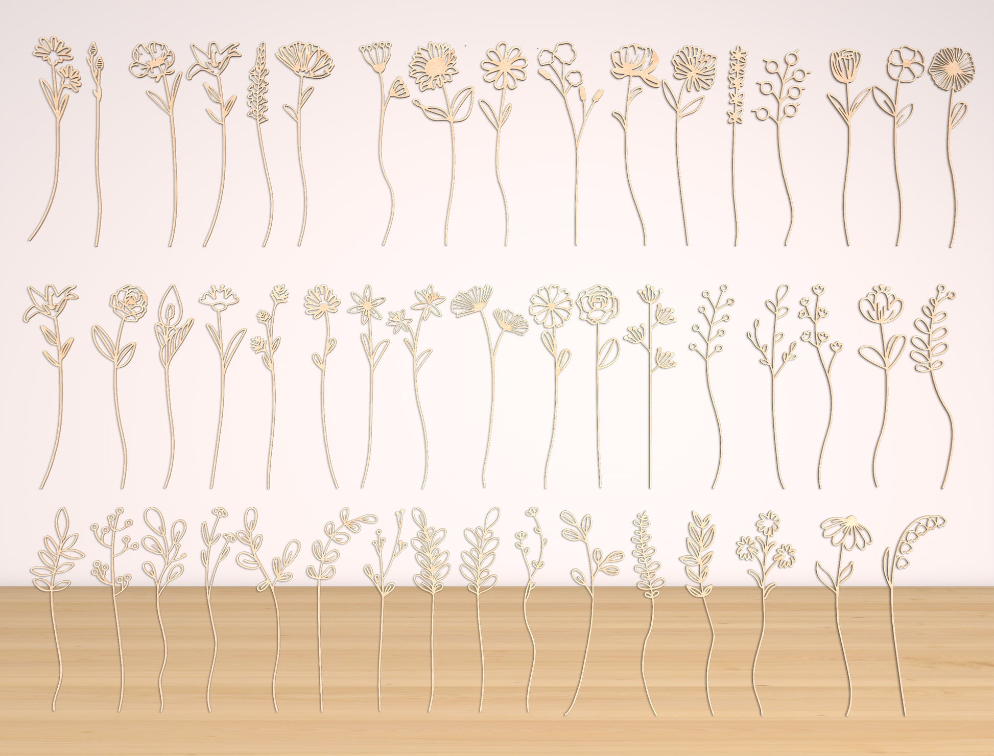 This set includes 51 individual wildflower stem designs and 1 wooden vase design, created to assemble elegant floral arrangements for laser cut decor. The wildflowers feature clean, minimalist botanical shapes with airy stems and natural curves, perfectly paired with a modern open-frame wooden vase.